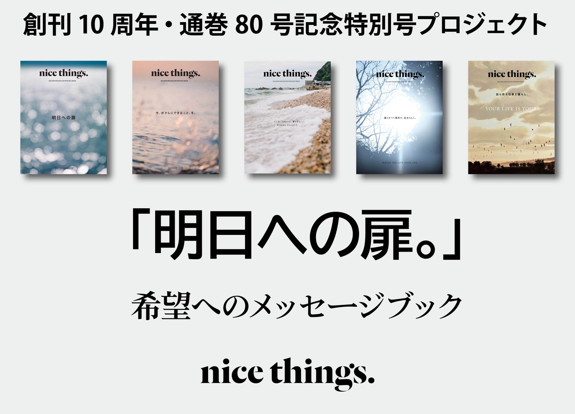 この特別号はnice things.で関わった方々に寄稿していただく形と対談やインタビューをメインに構成します。nice things.特別号「あなたへの、彼方への、希望へのメッセージブック」〈明日への扉〉というタイトルです。