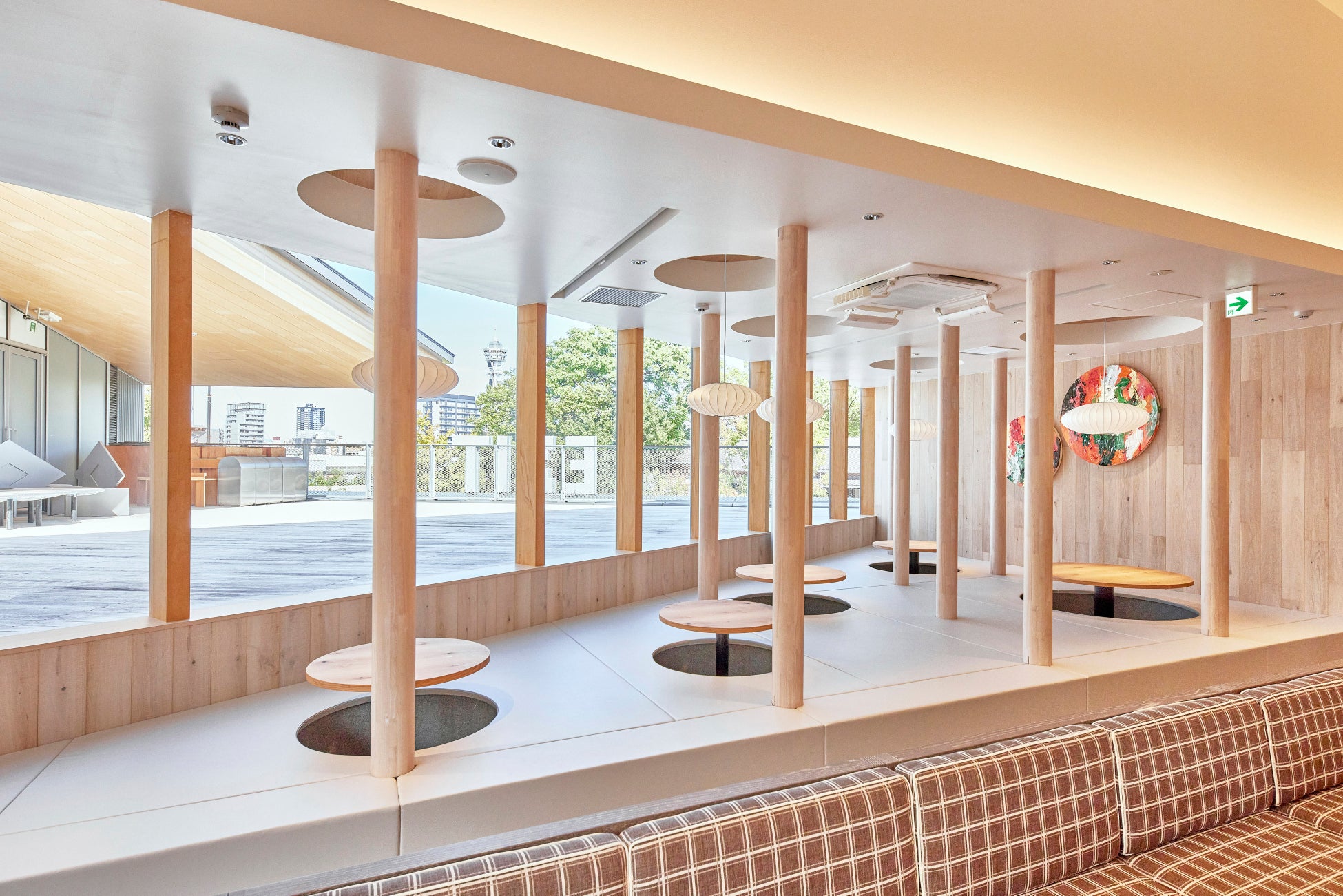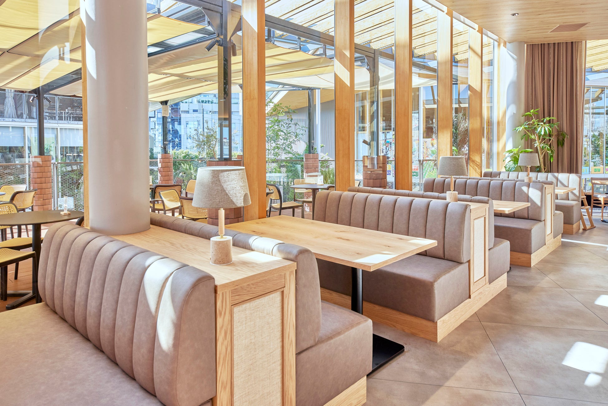 グリーンが溢れ、大きなガラス窓から光が差し込む開放的な店内は、時間を忘れてゆったり寛ぐことができます。店内のテーブルや通路はベビーカーや車椅子が入りやすいよう大きくゆとりが取られ、ご家族全員でご利用しやすいように考えられています。小さなお子様連れが嬉しい掘りごたつの座敷席やソファ席に加え、授乳室もご用意しており、子育て世代に優しい店舗を目指します。