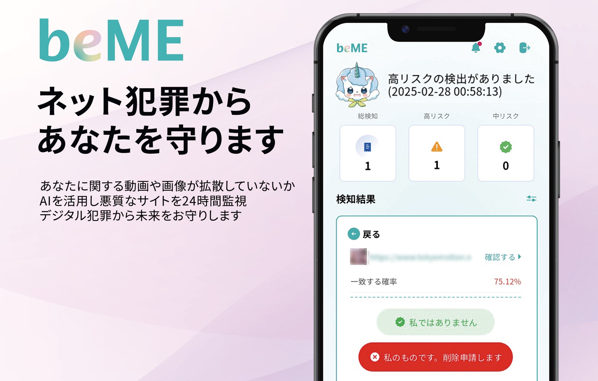インターネット上に無断で公開された性的画像・動画などをAIが常時監視。万が一の際には、法的対応を前提とした証拠保全もサポートします。