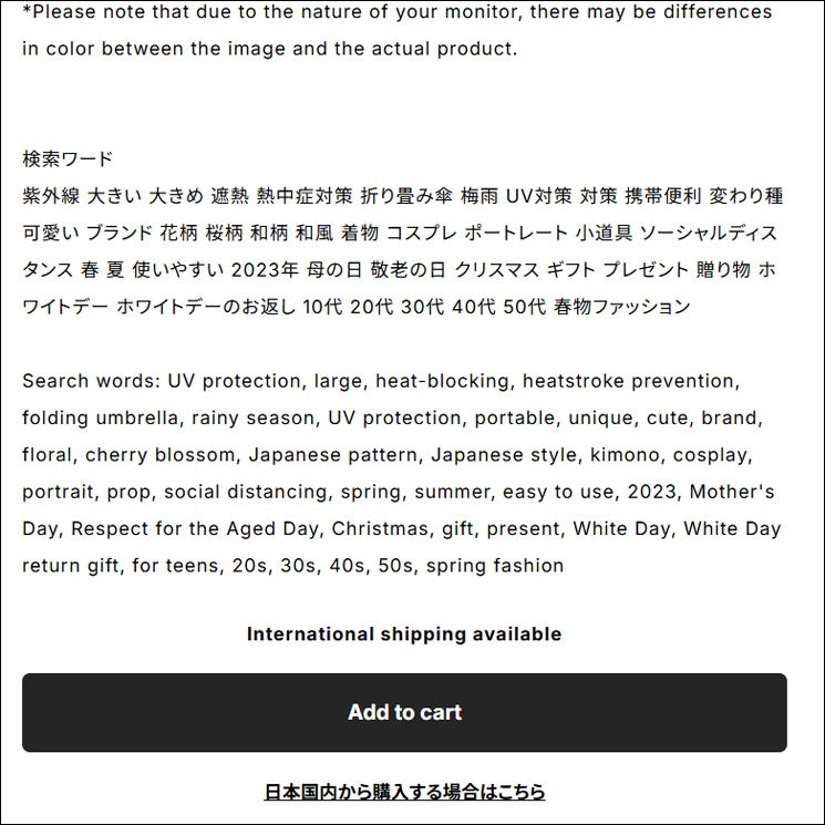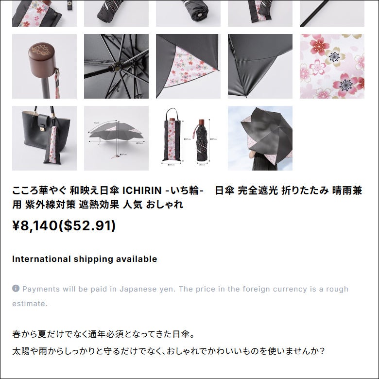 ネットショップ作成サービス「BASE」の「かんたん海外販売」機能は、海外在住のお客様がショップにアクセスすると、自動的に海外専用ショッピングカート版のページが表示されるシステムとなっております。ページに「International shipping available」と表記されている場合は国際配送可能な商品となります(ショップ内の一部の商品は非対応となるものもあります)。商品説明などは自動翻訳されないため、順次、英語表記の対応をしていく予定です。