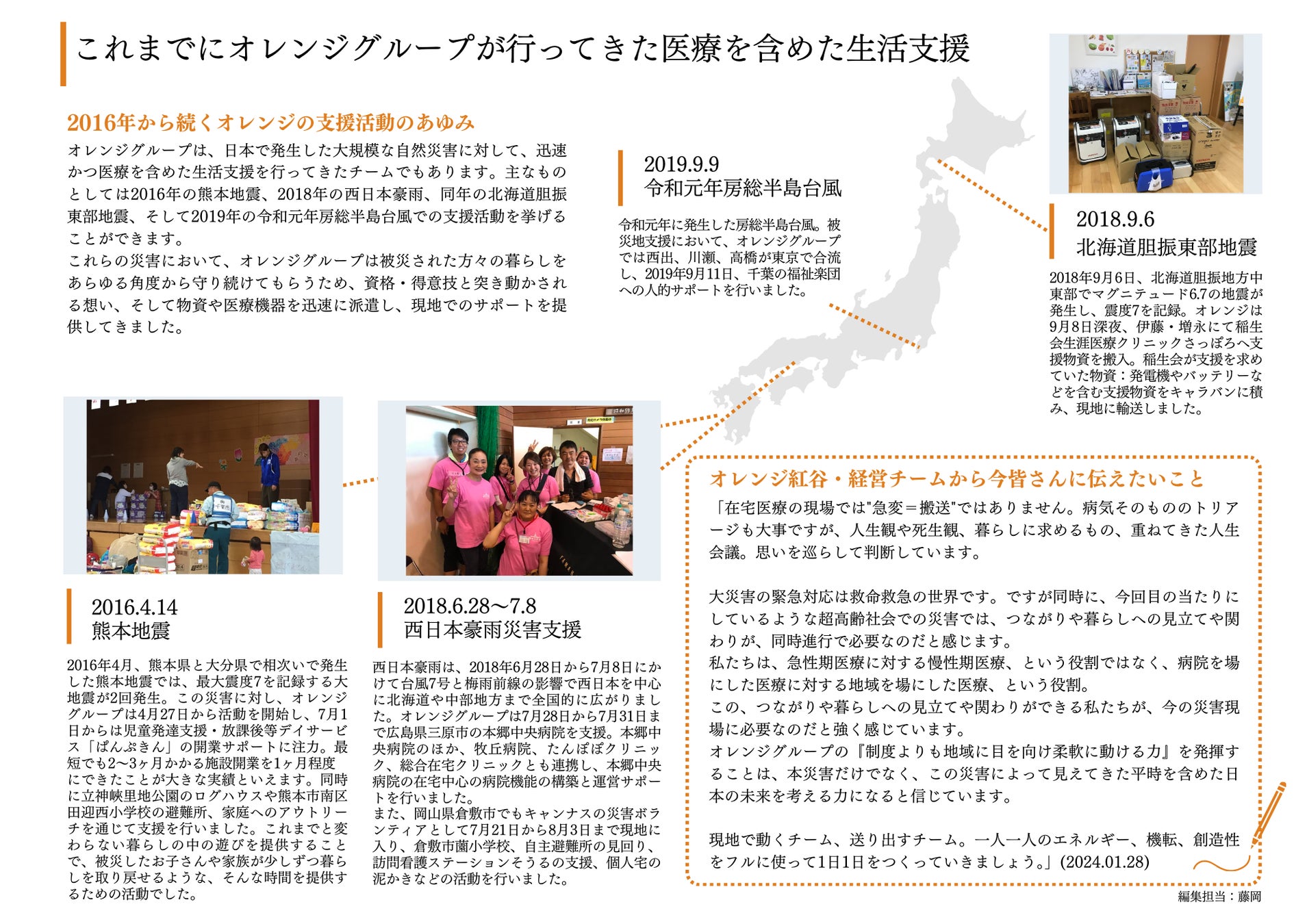 私たちは、日本で発生した大規模な自然災害に対して、迅速かつ医療を含めた生活支援を行ってきたチームでもあります。主なものとしては2016年の熊本地震、2018年の西日本豪雨、同年の北海道胆振東部地震、そして2019年の令和元年房総半島台風での支援活動を挙げることができます。これらの災害において、オレンジグループは被災された方々の暮らしをあらゆる角度から守り続けてもらうため、資格・得意技と突き動かされる想い、そして物資や医療機器を迅速に派遣し、現地でのサポートを提供してきました。