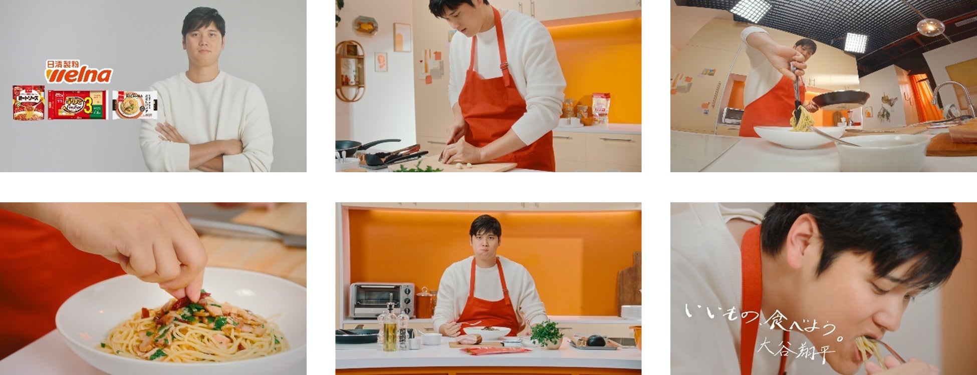 CMでは、日清製粉ウェルナのブランドカラーをイメージしたオレンジ色のエプロン姿の大谷選手が登場します。「マ・マー」のパスタを鍋に投入するシーンから始まり、食材を包丁で切ったり、フライパンで炒めたりと、大谷選手がパスタ作りに挑戦する様子に密着しています。パスタが出来上がると、お皿に綺麗に盛り付け、「はい、完成です!」と笑顔で一言。最後には、大きなひとくちで、自身で作ったパスタを味わい、「おいしいです!」と満面の笑み。