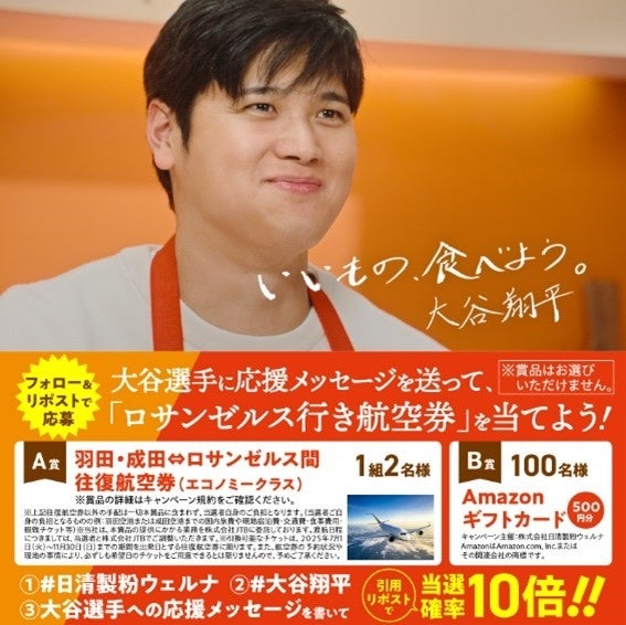 第二弾は、日清製粉ウェルナ公式Xアカウントをフォローし、対象投稿をリポストした方の中から抽選で、羽田・成田⇔ロサンゼルス間往復航空券(エコノミークラス)を1組2名様、Amazonギフトカード500円分を100名様にプレゼントします。