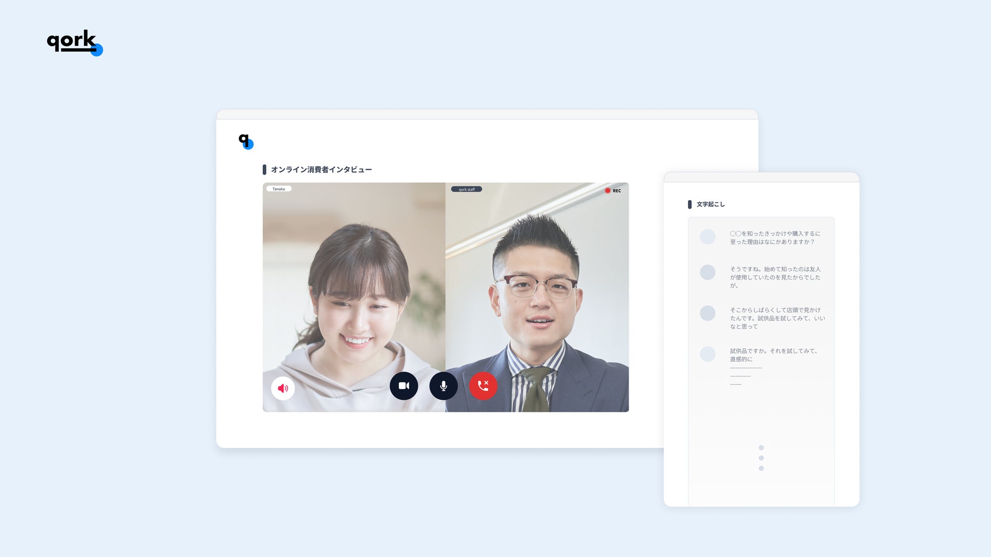 「リサーチャーのためのインタビューサービス」をコンセプトに開発されたqorkは、定性調査の全ての工程において業務負荷と所要時間を劇的に減らし、リサーチャーが調査の本質的な課題に向き合う時間を作ることで、持てる力を最大限に発揮できるよう設計されております。qorkの活用によって、弊社リサーチャーによる定性調査(オンラインインタビュー)は短納期・高効率・高精度でのアウトプット創出を実現できており、クライアント企業様からも高い評価をいただいております。