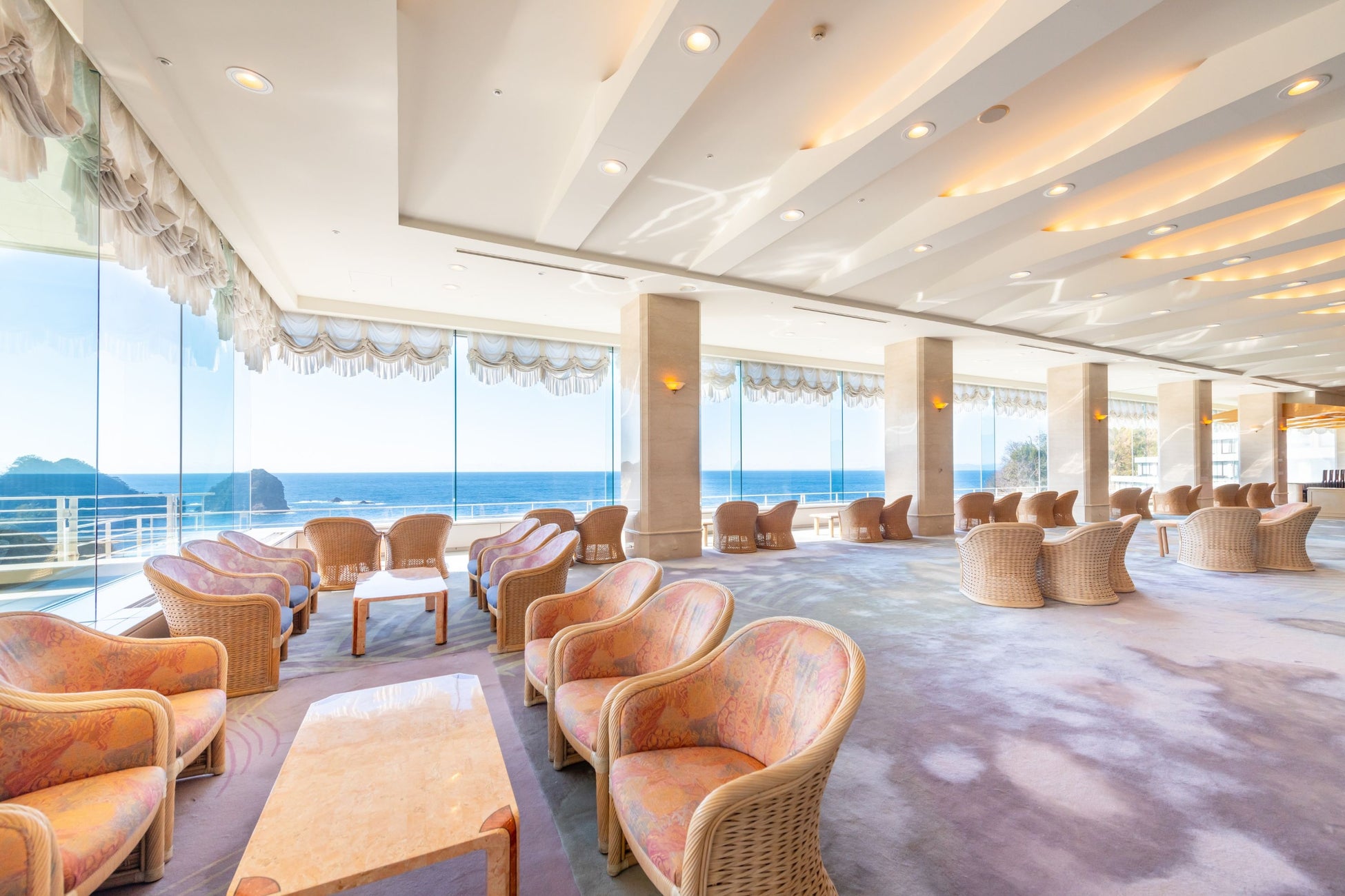 堂ヶ島ニュー銀水は充実の館内施設が自慢。西伊豆の海岸線や駿河湾の水平線を一望できる展望ロビーラウンジ「オンディーナ」では、9:00~22:00までフリードリンク・15:00~17:00まで生ビールを提供しており、ご宿泊のお客様は好きなタイミングで何度でもお楽しみいただけます。横の長さ39メートル、高さ3メートルの大きなガラス越しに見える景勝地・西伊豆の景観が広がり、10月中旬~3月上旬までは日本の夕陽百選にも選ばれた西伊豆・堂ヶ島の夕陽を眺めながらゆったりとしたひとときを過ごすことができます。またロビーにはアメニティステーションも新設しており、好みに合わせた選べる楽しさを提供しています。