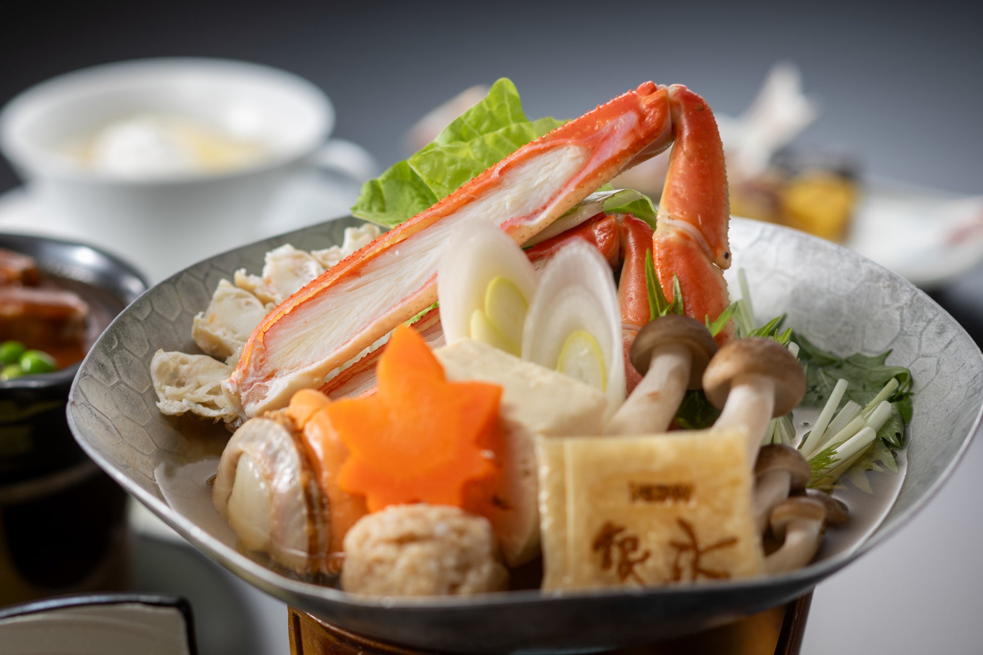 会席メニューは宿泊プランによって内容が異なり、5種類のプランを販売。冬の期間限定で、本ズワイガニの「かに鍋&焼きかに」会席コースが登場。「海鮮鍋」「焼きかに」「茶碗蒸し」のかにづくしの会席メニューを味わうことができます。冬ならではの人気メニューを心ゆくまでお楽しみください。