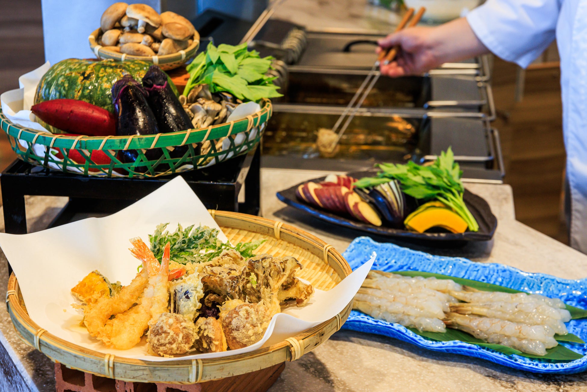 堂ヶ島ニュー銀水の夕食は、2024年9月1日より「選べる楽しさ」を提供する新しい夕食スタイルに。宿泊プランによって異なる会席メニューに加え、本まぐろや金目鯛などの旬のお刺身や季節の食材を提供する天ぷらなどは会場内で調理を行い、出来たてをお好きなだけ味わうことができます。「かに食べ放題」開催期間は、刺身や天ぷらなどのビュッフェメニューは変わらず、さらにボイルしたかにも食べ放題でお楽しみいただけます。