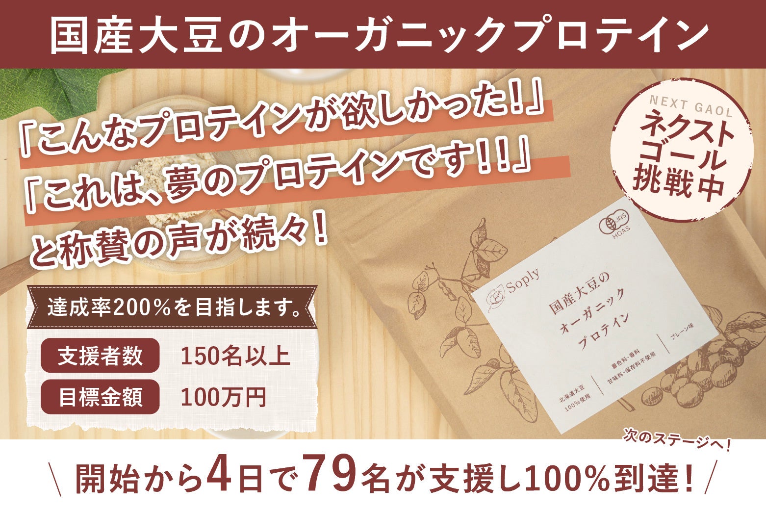 国産大豆を使用したオーガニックプロテインを製造・販売するSoply(ソプリー)は、11月21日からクラウドファンディング(サイト名:CAMPFIRE)による先行販売を開始しておりました。プロジェクトの公開から4日後の11月24日に目標金額に到達。到達時点で79名の支援が集まり、オーガニックプロテインへの期待と需要が浮き彫りになりました。