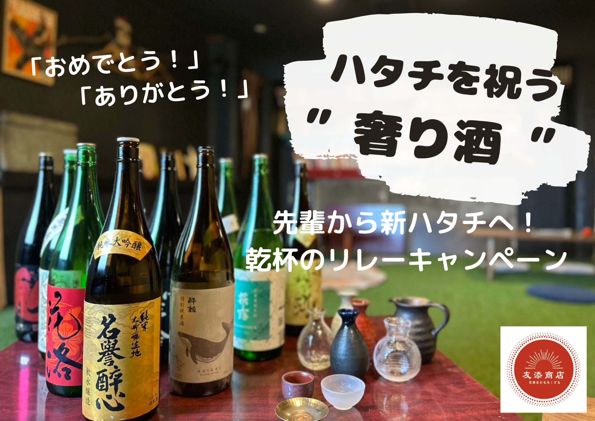 式典参加の対象年齢である平成16年4月2日から平成17年4月1日までにお生まれの方(新ハタチの君)に、当店をご利用のお客さまである「先輩」から、お祝いとしてお酒を奢るリレーです。