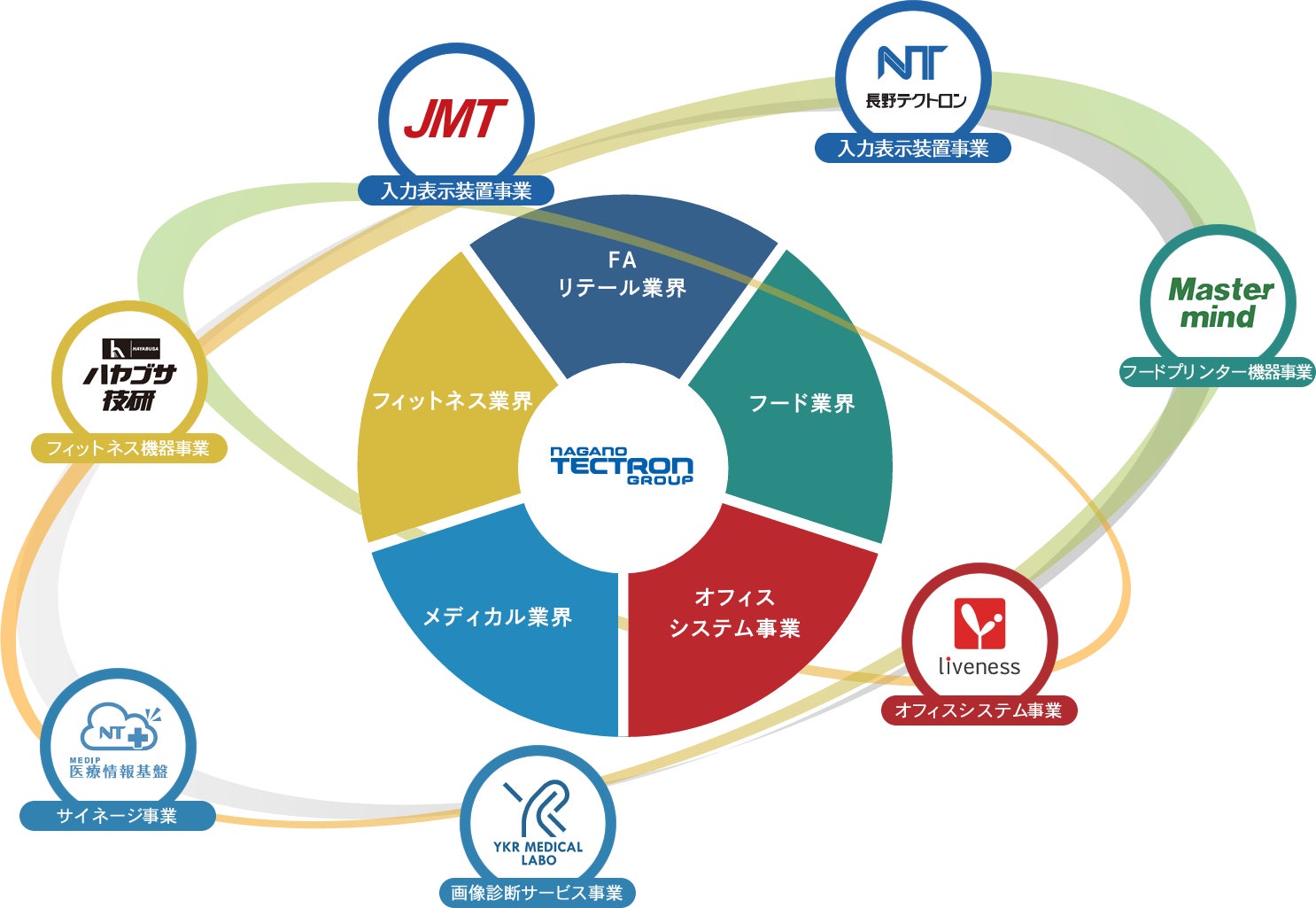 長野テクトロングループ株式会社は、長野テクトロン株式会社、株式会社医療情報基盤、株式会社ライブネス、YKR medical labo株式会社、株式会社ハヤブサ技研、株式会社マスターマインドを傘下に持ち、医療、フィットネス、オフィスなどの多岐にわたる分野でのシナジー効果を生み出しています。各業界のニッチトップ企業と協力しながら、グループ一丸となって新たな価値を提供し続けています。