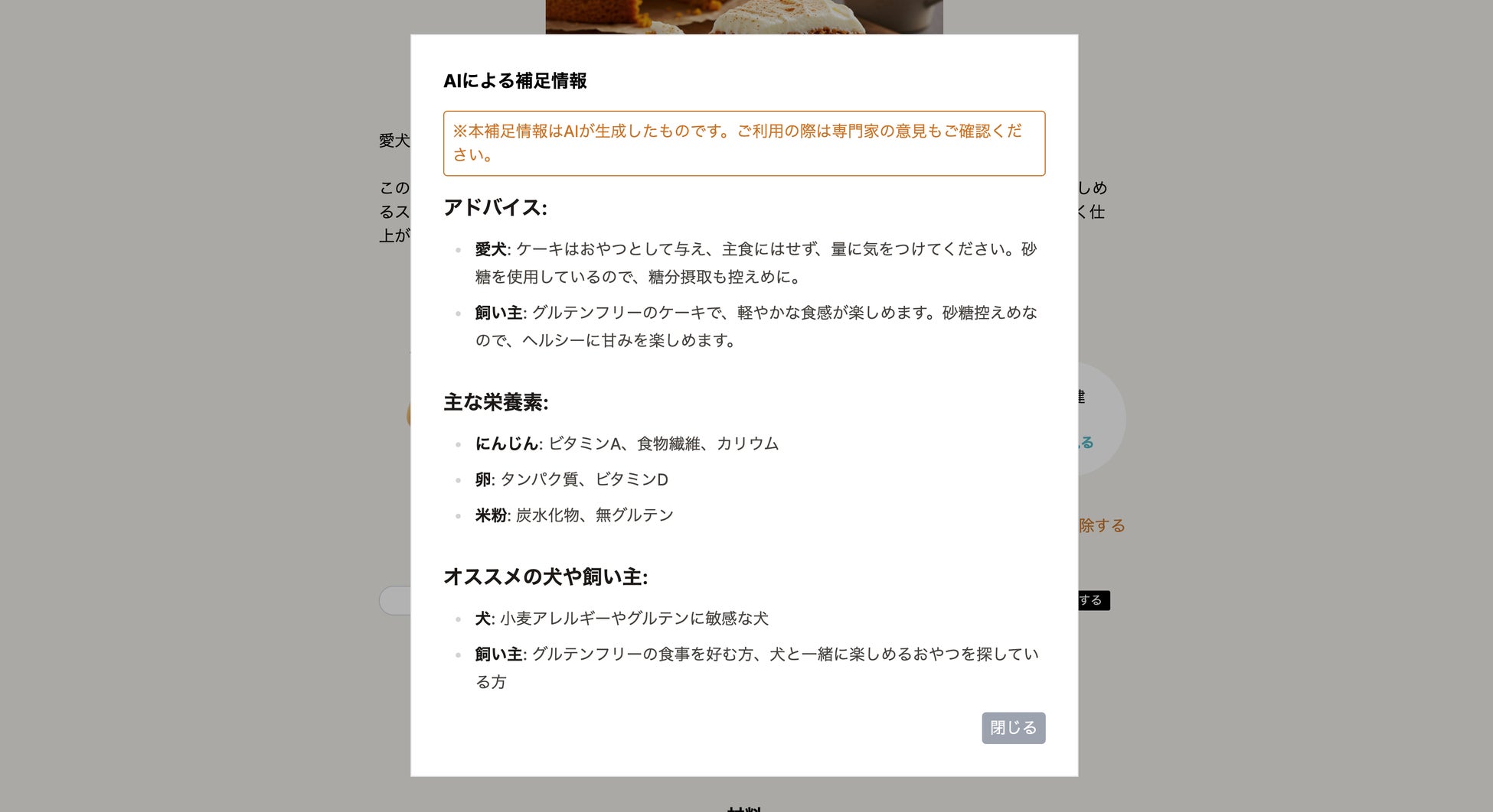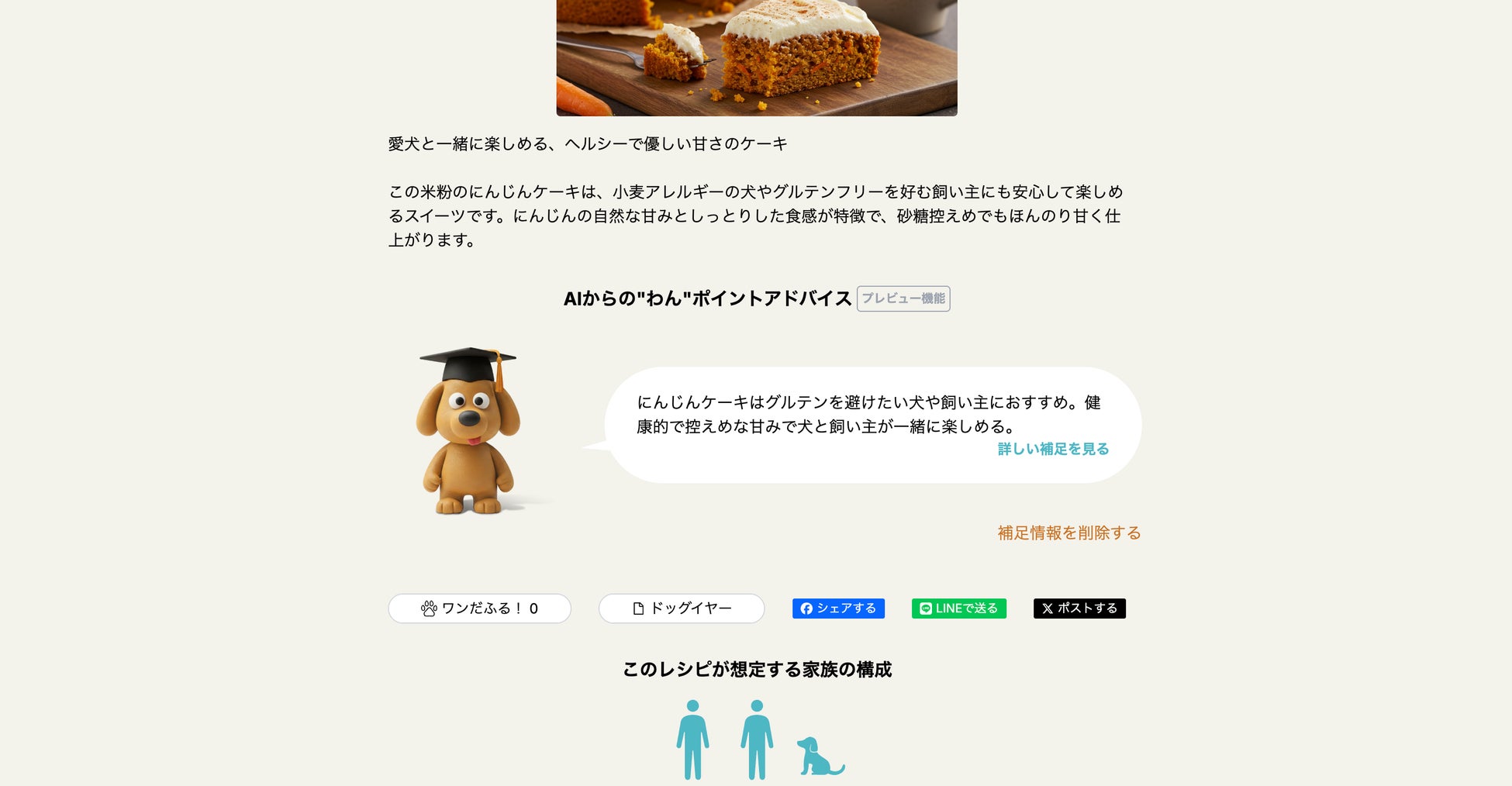 レシピがどのような犬種や飼い主に向いているかをAIが判断し、ユーザーに提案します。例えば、ダイエット中の犬やアレルギーに配慮したレシピなど、ターゲット層を絞ったアドバイスを行います。
