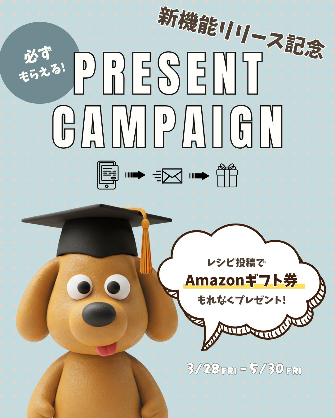 「WagMog」の新規機能のリリースを記念して、レシピを投稿していただいた方全員にAmazonギフト券をプレゼントするキャンペーンを実施いたします。誰でも簡単にレシピを投稿・保存・共有することが可能となっておりますので、お気軽にご参加ください。