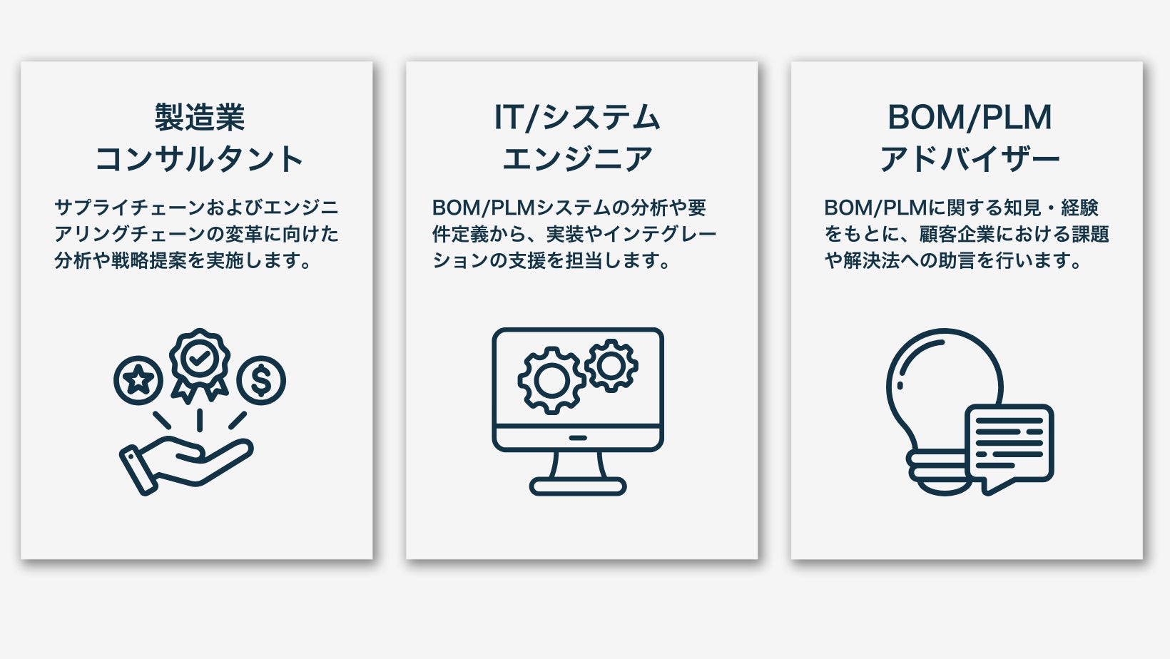 年代、性別、国籍問わず、製造業のBOM/PLM領域の知見、経験を持つあらゆるエキスパートを対象としています。顧客の課題に寄り添い、BOM/PLMの知識、経験を踏まえて課題解決のために地に足をつけた取り組みができるあらゆる方を歓迎します。