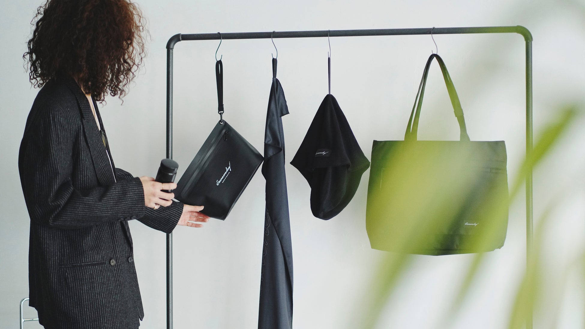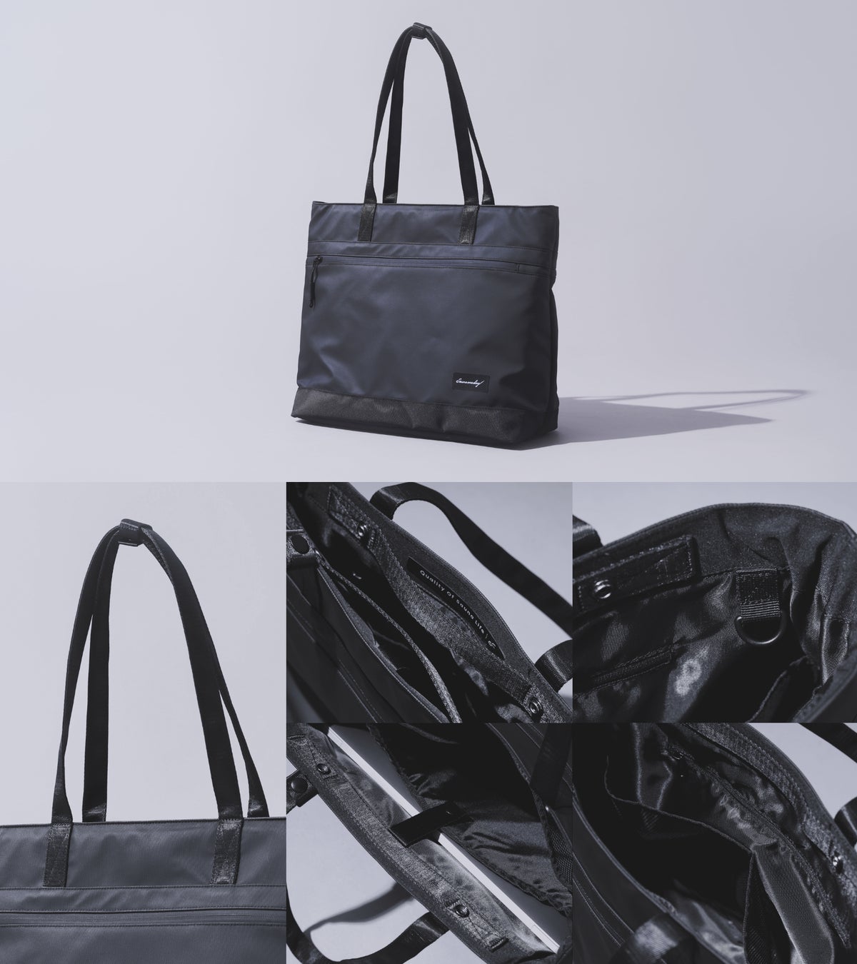 サウナとバッグの相性を考えると、背中が蒸れるリュックよりトートバッグがおすすめ。ハンドルは長めの設計にすることで服を着込んでも肩がけしやすくオールシーズン使いやすい。インナーに忍ばせたショートハンドルで手持ちもできる2WAY仕様。バッグ外側のメインファブリックにはナイロンの糸を高密度に織ったナイロンオックスフォード900Dを採用。両面に付いている外ポケットにはTPU素材の止水ジッパーを使用し、内部生地は水を弾くポリエステル素材にすることで、濡れたタオルや水着を直接収納することもできる。バッグ内側には16incのラップトップが収納できるPCポケット、ガジェットや着替えが収納できるメッシュポケット、時計やアクセサリーが収納できるショートポケット、鍵の取り出しに便利なキーリング、バッグの開閉ができるスナップボタンを装備。ビジネスライクなルックとサウナライフのための機能性が共存したSaunaonedayのシグネチャーアイテム。