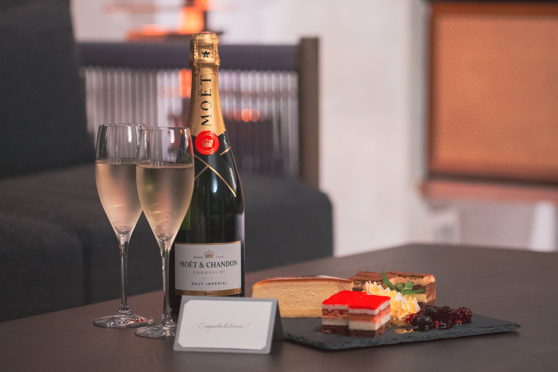 ご到着の客室には、シャンパンのフルボトルと、想いを綴るアニバーサリーカード、