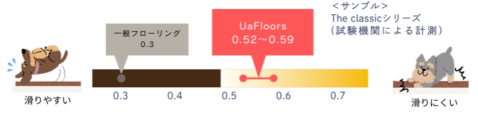 銀イオンを用いたナノ抗菌により、細菌やウィルスに対しても安心できるフローリングです。また、犬の足の滑りやすさの基準である滑り抵抗値CSR-Dは「0.59」(試験機関による計測)で、一般的なフローリングよりも滑りにくく、愛犬の足や膝への負担が軽減され、安心して生活できます。