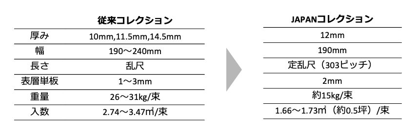 今回発売の「JAPAN COLLECTION」では、既存ラインナップの販売でお客様からいただいたご意見をもとに、以下の改良を行いました。日本の住宅規格に合わせた12mm厚に統一し、長さを303ピッチの定乱尺に変更し、国内の床暖房住宅の施工基準に合わせました。その他、コレクションよる違いや国内需要に合わせた梱包に変更しました。
