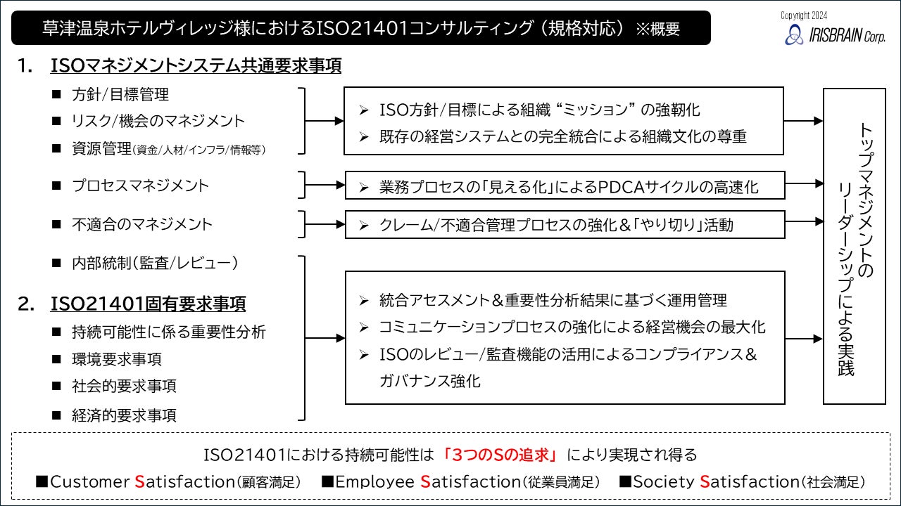 合同会社アイリスブレイン(東京都中央区、代表:森 健人)は、コンサルティング支援を行った「草津温泉ホテルヴィレッジ」(株式会社中沢ヴィレッジ、群馬県吾妻郡草津町、代表取締役 中澤一裕様)が、日本国内で初(※)となる国際規格ISO21401の認証を取得したことをお知らせいたします。