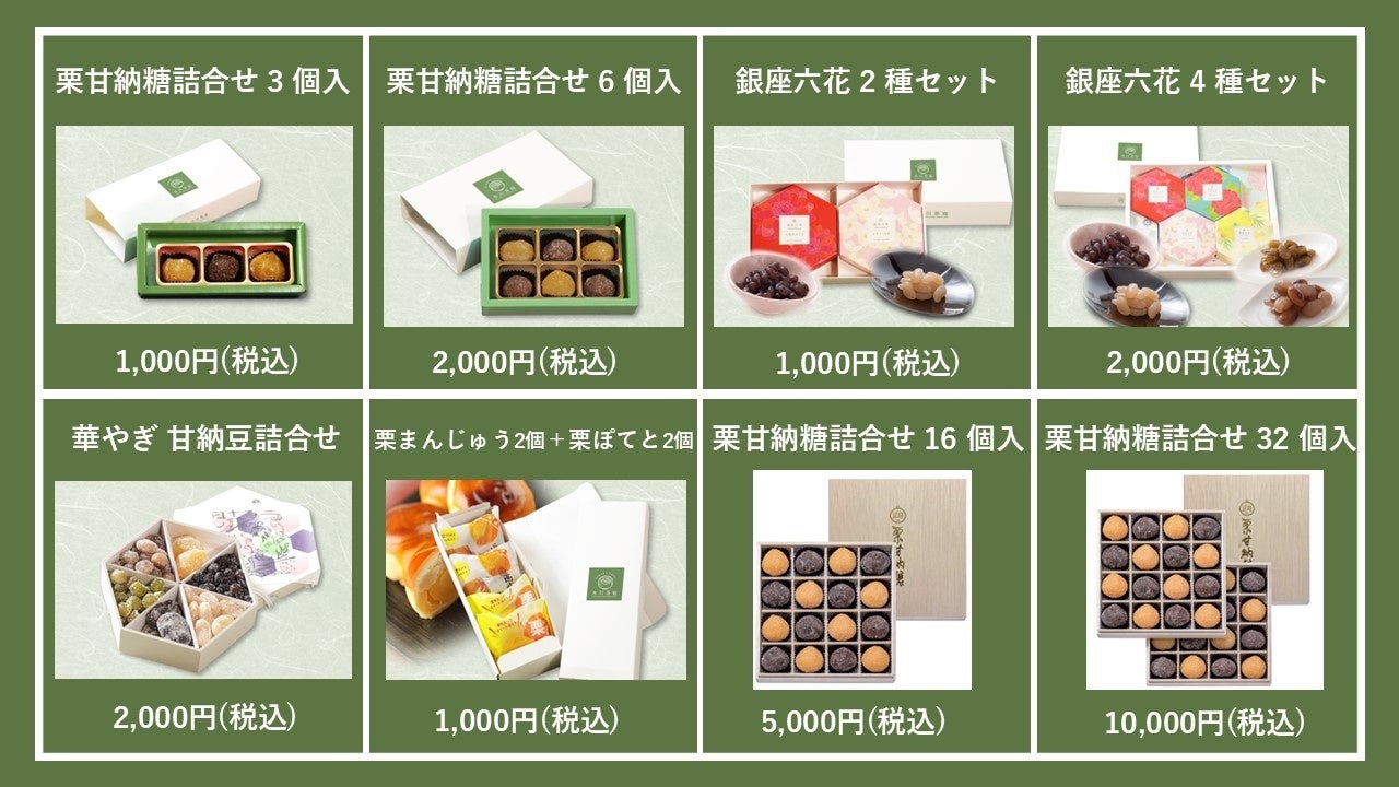 ・栗甘納糖詰合せ16個入 5,000円(税込) ・栗甘納糖詰合せ32個入 10,000円(税込)
