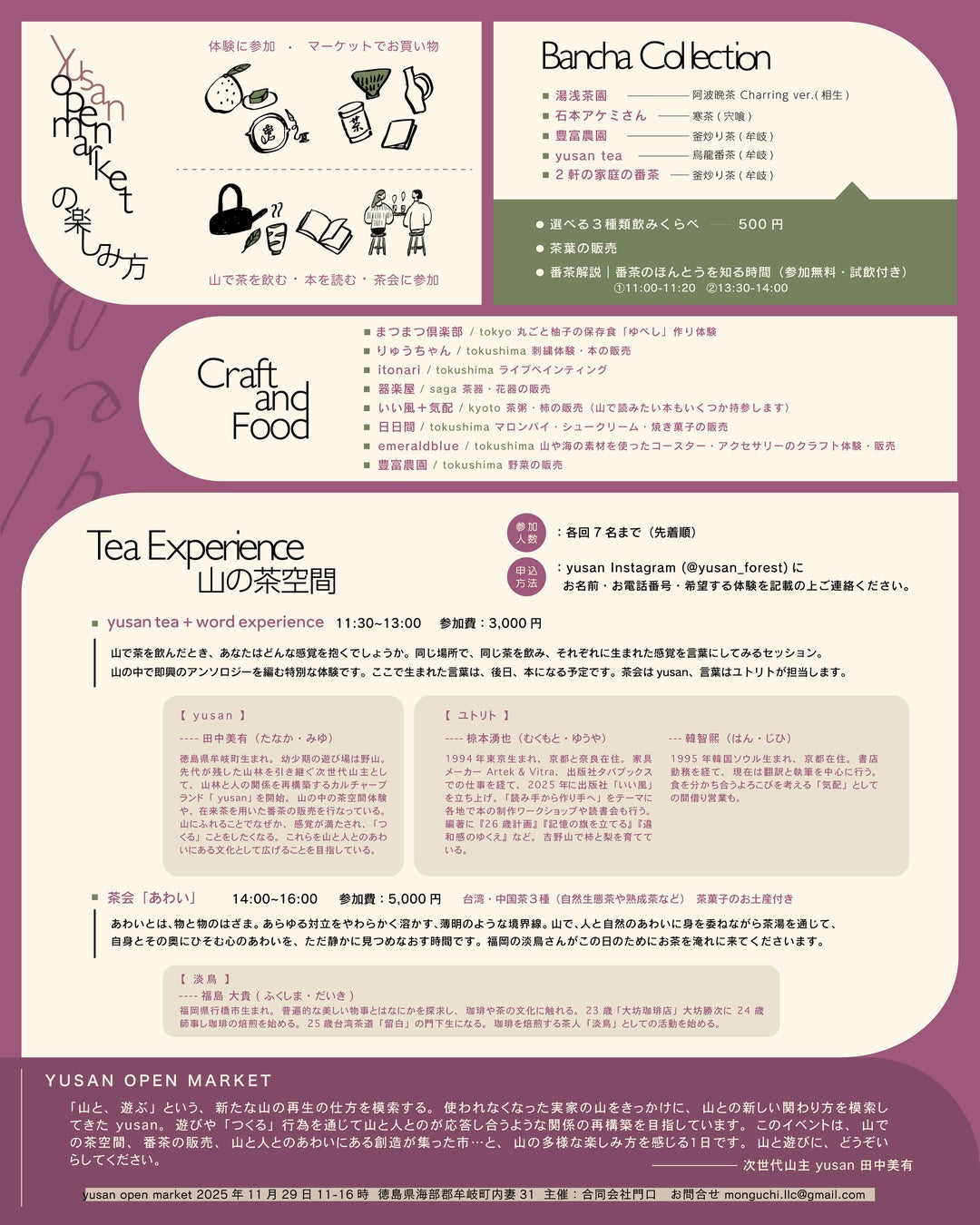 11月29日の「yusan」正式リリースとオープンマーケットを起点に、番茶「yusan bancha」の販売、出張企画、椅子のプロトタイプ発表を順次進めます。また、月に一回はyusanの拠点である茶空間/shopのオープンdayを実施予定です。次回は2026年1月10日(土)~12日(月・祝)の3日間です。