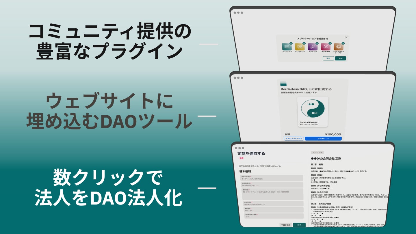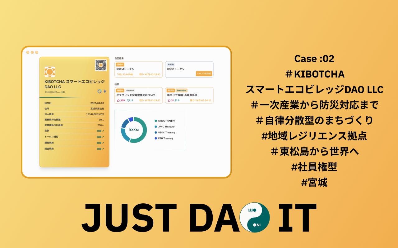 DAO法人の為のOS(Operating System)を手がけるボーダーレス合同会社(本社:東京都渋谷区、代表社員:岡 崇)は、ノーコードで合同会社をDAO(自立分散型組織)化し、会社資産や権利のトークン化から自己募集までを一気通貫で実現する新サービス「JUST DAO IT(ジャスト・ダオ・イット)」において、本日よりクローズドβ版の利用者募集を開始したことをお知らせします。