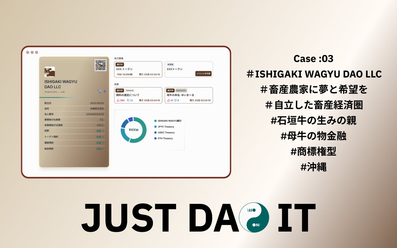 ISHIGAKI WAGYU DAO LLC、沖縄の「ゆいまーる」(相互扶助)の精神に基づき、石垣牛生産者と消費者が直接つながる新しい畜産エコシステム「ISHIGAKI WAGYU DAO LLC」が誕生。資金難に苦しむ離島の1次産業従事者を支援し、伝統的な石垣牛の品質と文化を次世代に継承。生産者の誇りと消費者の喜びを結び、1次産業を若者が希望を持って稼げる産業へと変革する一歩となるプロジェクトです。