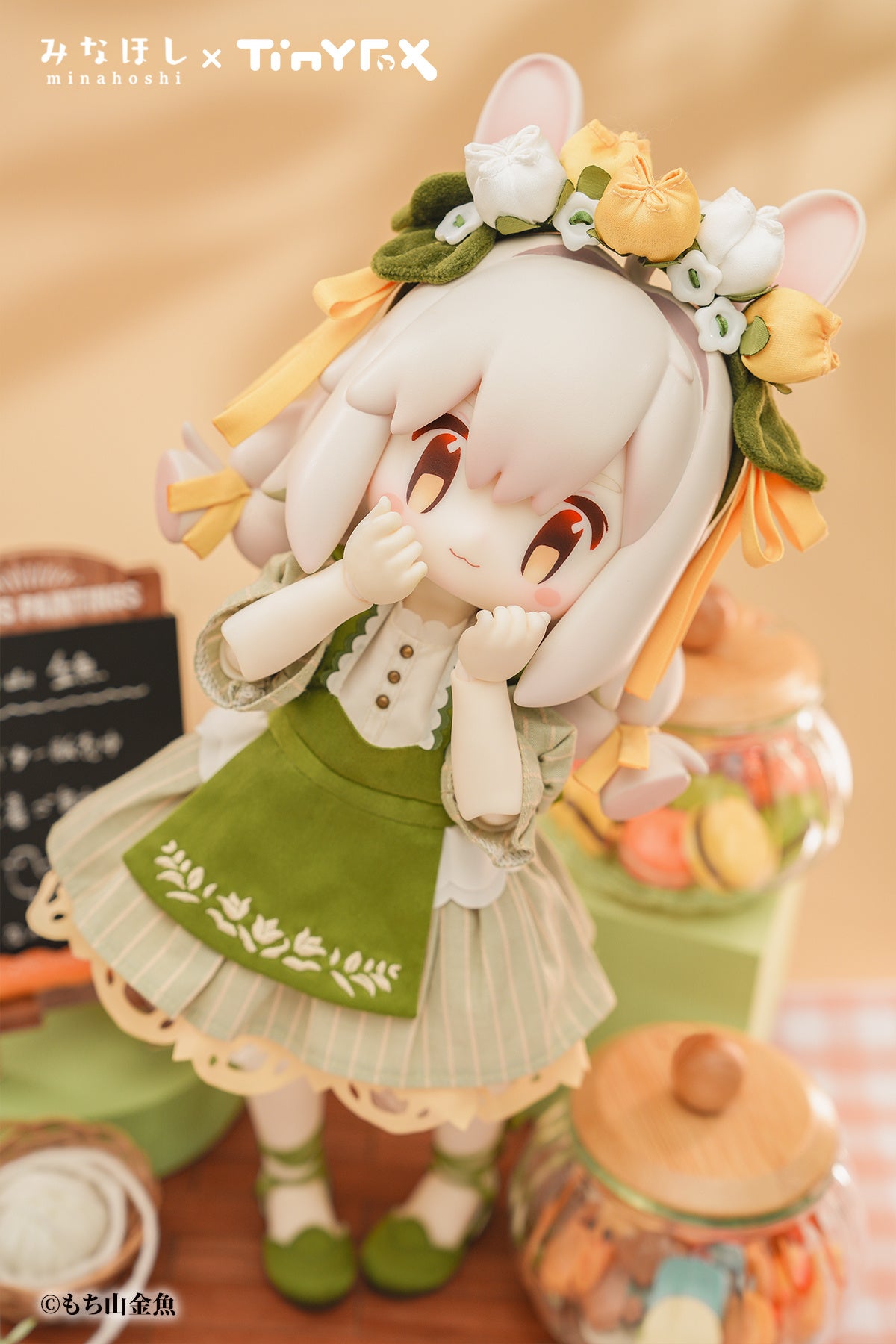 「大根」と「水仙」を入れた大きなリュック、グリーンの縞模様のエプロンを身につけた「みなほしちゃん」。VRChatでは、おいしいパンと野菜が大好きで元気キャラとして人気者のアバター「みなほしちゃん」。今回のドール化では「みなほしちゃん」の特徴である、大きな目、チューリップバージョンのウサ耳カチューシャに。エプロンドレス、グリーンのイメージで統一し、3Dキャラクターをリアルに再現しています。