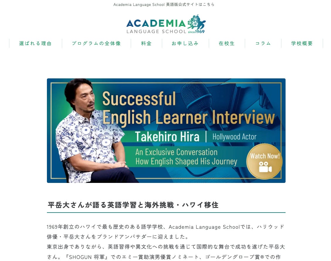 また、平岳大さんの国際的な成功を支えた英語学習や海外挑戦のエピソード、ハワイ移住に至った背景を語る Successful English Learner Interview の動画をアカデミア公式サイトおよび公式YouTubeチャンネルで公開しました。