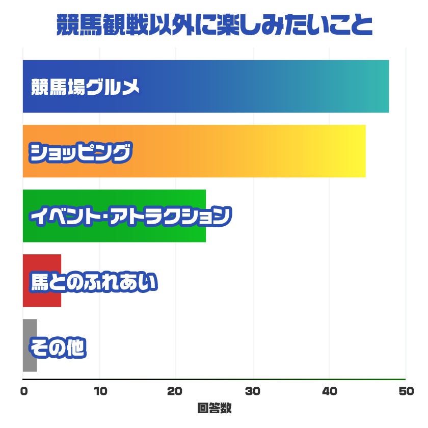 競馬場で競馬以外で楽しみたいことを調査したところ「美味しいグルメやお酒」「ショッピング」が圧倒的でした。やはり、料理やショッピングはデートの楽しみですよね。