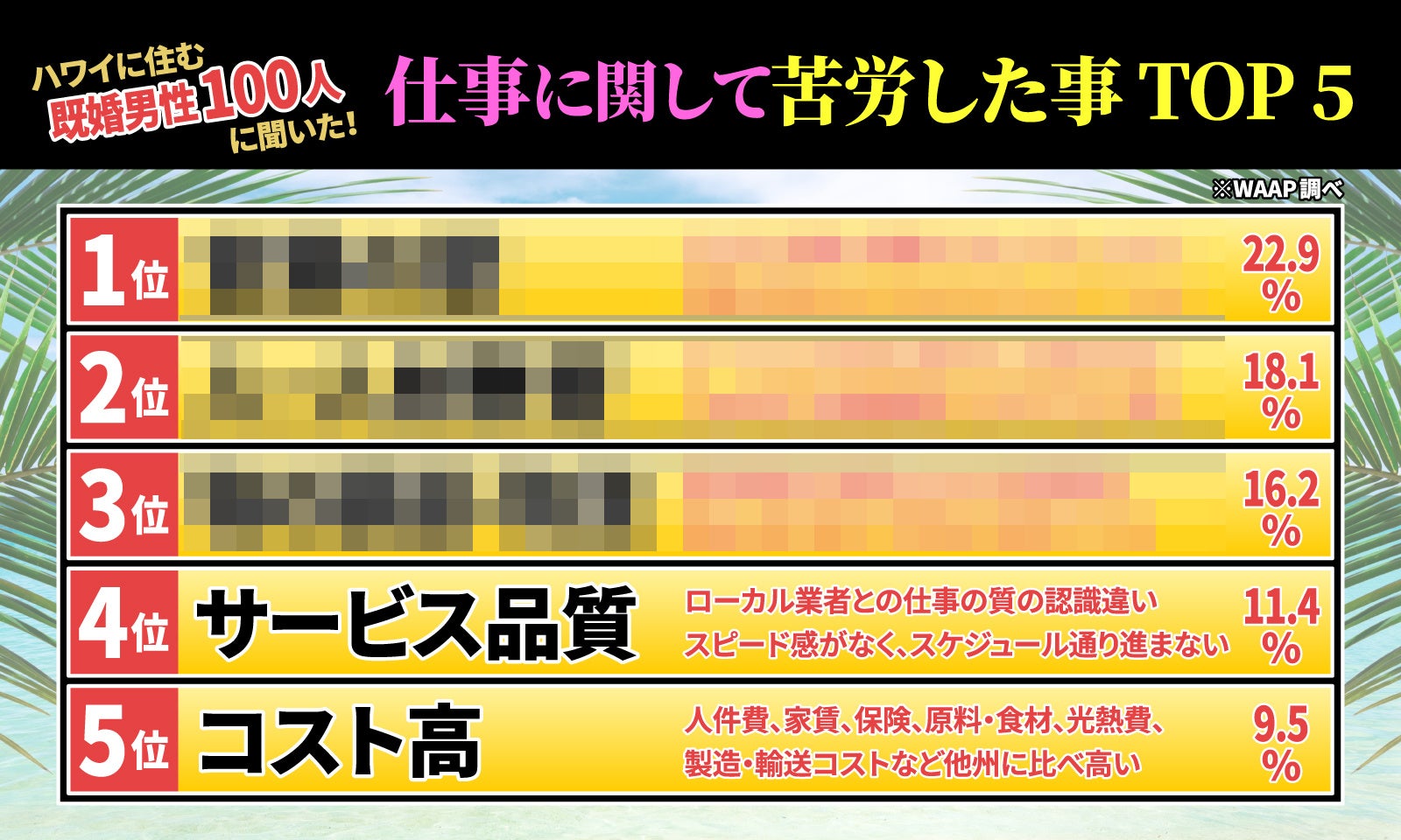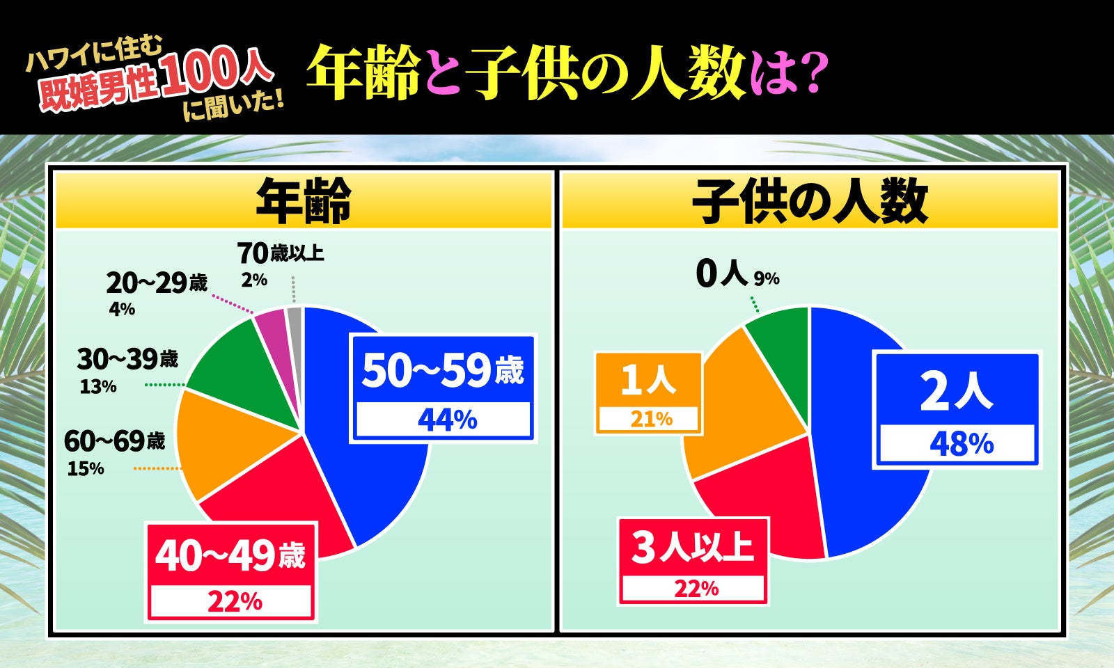 本番組では、ハワイ在住の既婚日本人男性100人に対し、「ハワイでの仕事と生活」に関する実態調査を実施。その結果をランキング形式で番組内で初公開しました。