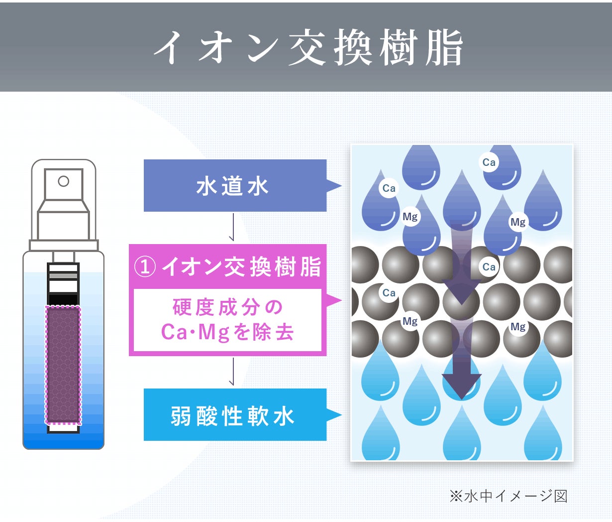 ボトルに入れた水がイオン交換フィルターを通って弱酸性軟水へ変化。繊維状活性炭が残留塩素やにおい成分を除去し、残留塩素濃度を0.05mg/L以下に。