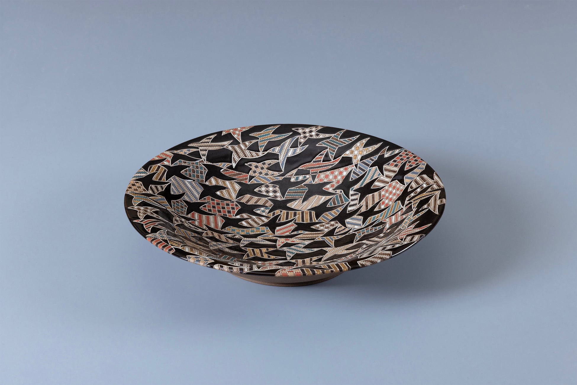 象嵌(ぞうがん)技法を用いた繊細で美しい装飾のうつわが並びます。装飾性と機能性を併せ持つ作品が高く評価されています。