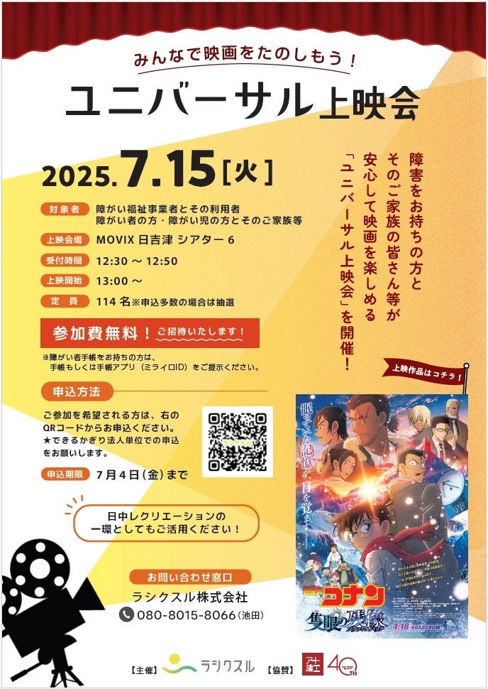 ラシクスル株式会社(本社:鳥取県米子市両三柳255-8)は、株式会社アート建工(本社:ラシクスル同)後援による「ユニバーサル上映会:名探偵コナン 隻眼の残像」を、2025年7月15日(火)13:00よりMOVIX日吉津シアター6にて開催します。障がいのある方やそのご家族が配慮された環境で、安心して映画館の臨場感を体験できる上映会です。