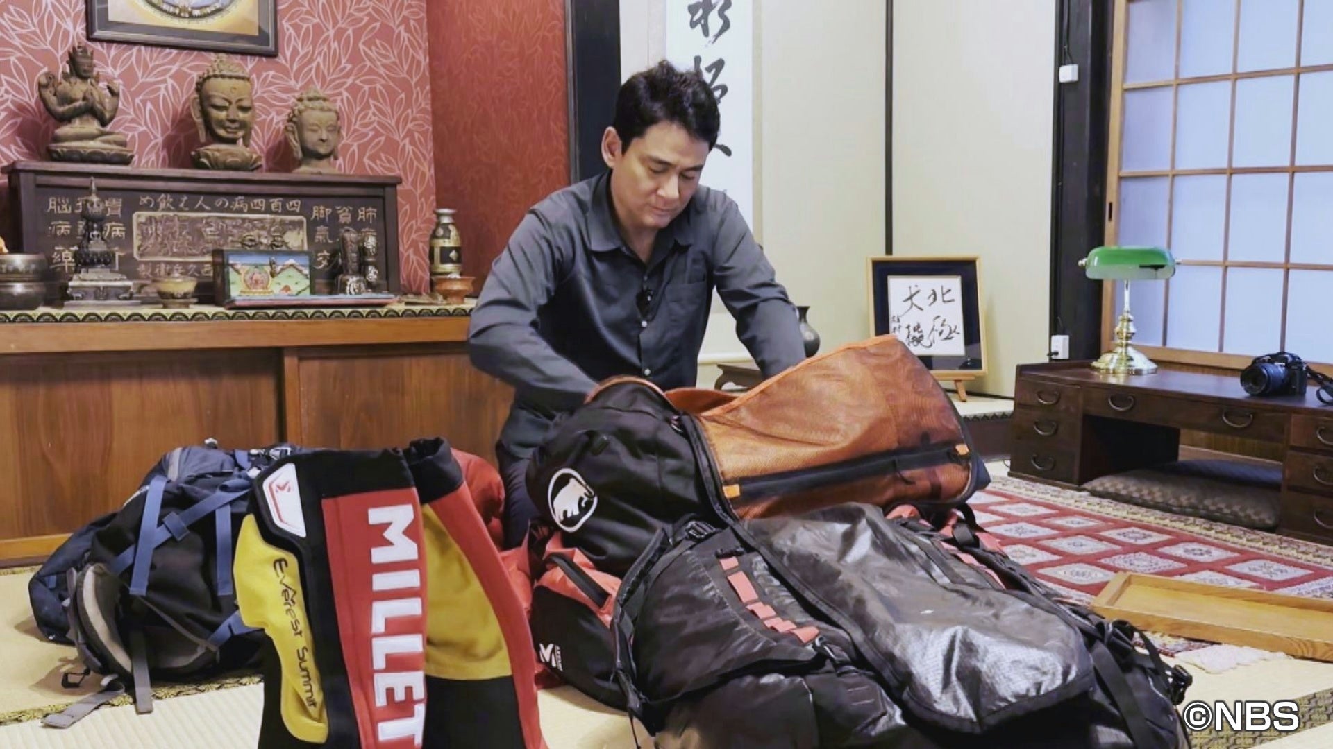 植村と一緒にエベレストを登るため、野口は山梨の自宅でパッキングをする。