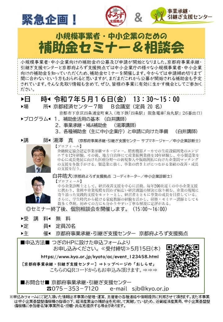 京都府事業承継・引継ぎ支援センターと京都府よろず支援拠点では中小企業庁の様々な小規模事業者・中小企業向けの補助金を知っていただくため、緊急企画として「小規模事業者・中小企業のための補助金セミナー&相談会」を開催します。今からでは申請締め切りまで間に合わないという方もおられると思いますが、まだまだこれから公募が開始される補助金も予定されています。そんな先取り情報も含めて、ぜひ、皆様の事業に有効に生かす機会としてご参加ください。