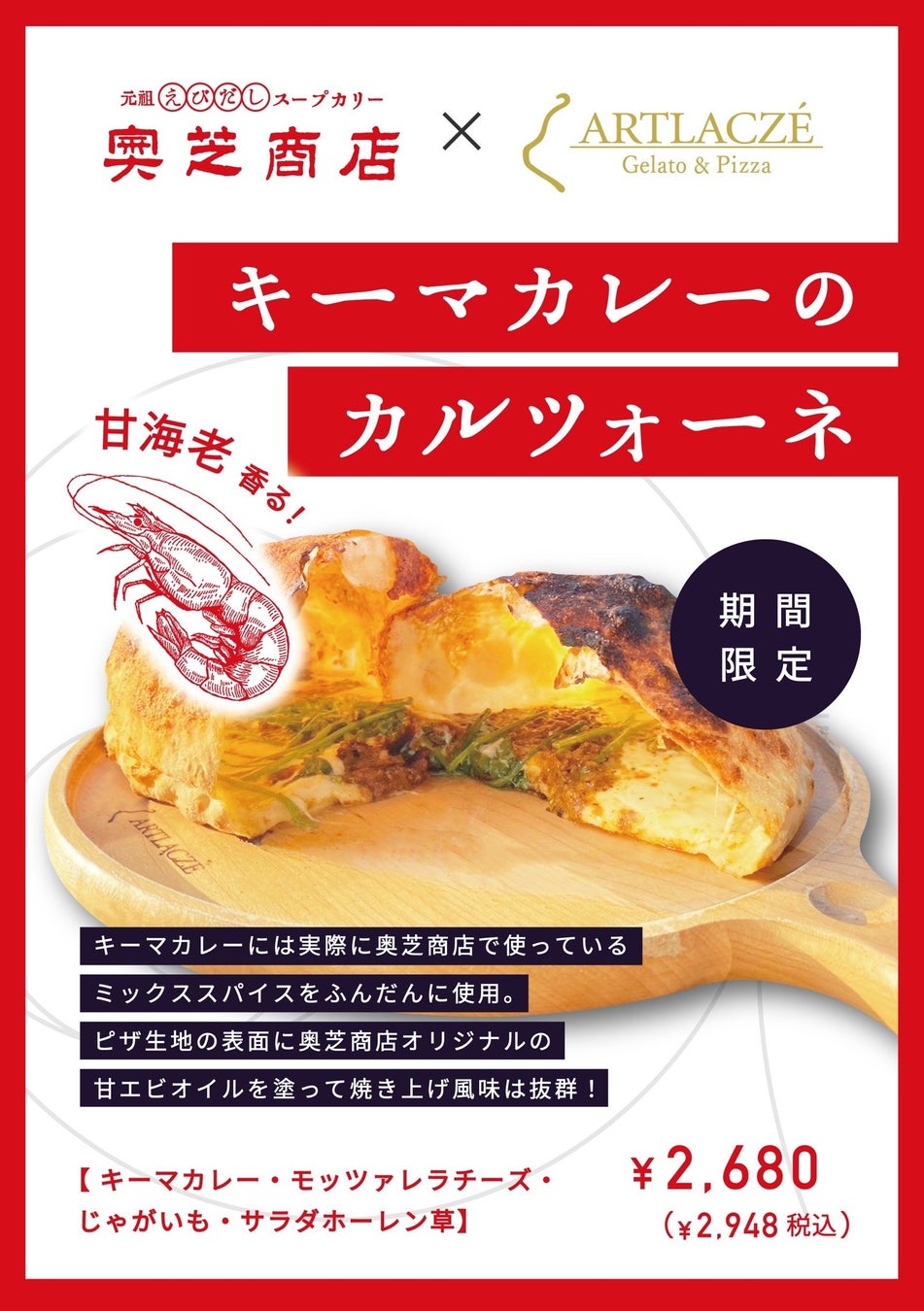 今回登場する「キーマカレーのカルツォーネ」は、奥芝商店の秘伝スパイスで作ったキーマカレーを特製カルツォーネで包んだ商品です。ボリューム満点で、切り分ける楽しさや、湯気とともに広がる奥芝商店オリジナル秘伝スパイスの香りをお楽しみいただけます。また、表面に奥芝商店自慢の「甘海老オイル」を塗って焼き上げることで、より深みのある風味が食欲を刺激する唯一無二のコラボレーションピッツァが誕生しました。このコラボレーションにより、ここでしか味わえない美味しさが体験できます。