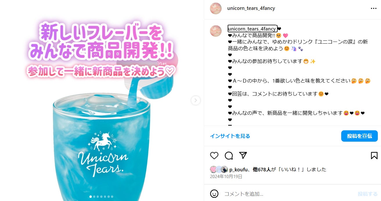 2024年10月19日、弊社のユニコーンティアーズ公式インスタグラムで実施しました「ユニコーンの涙」の新しいフレーバーを決める商品開発ミーティングにて、投票結果により「シャインマスカット味」が選ばれました。続けて、公式インスタグラムで12月6日に実施した商品開発ミーティングでは、「シャインマスカット味」のパッケージデザインも決定!!