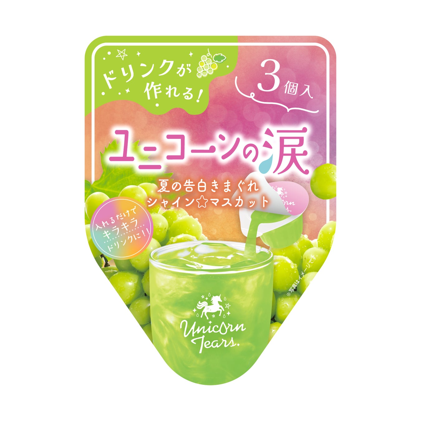 200万乙女のときめき&ゆめかわポエミースイーツ『ユニコーンティアーズ』は、市販のサイダーに混ぜるだけで、キラキラに輝くオーロラドリンクが作れる「ユニコーンの涙」の新商品、シャインマスカット味「夏の告白 きまぐれシャイン☆マスカット」を、2025年2月7日(金)より、全国の取り扱い店舗にて発売いたします。