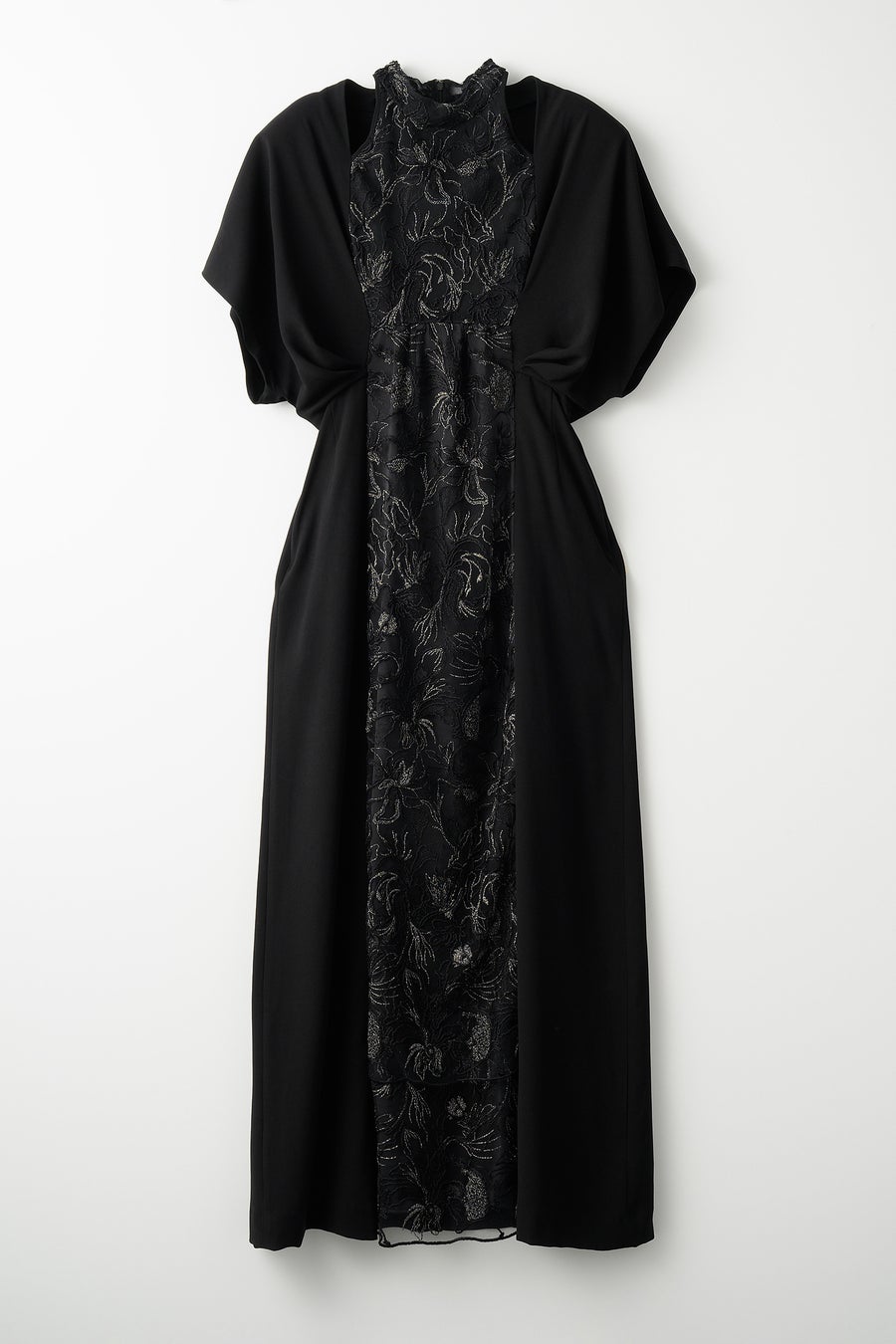 蕾を思わせるケープショルダーのカッティングと、縦のラインを強調するレースの切り替えが特徴です。ポケット付きで実用性も備え、裏地付きのため透け感を気にせず快適に着用可能です。