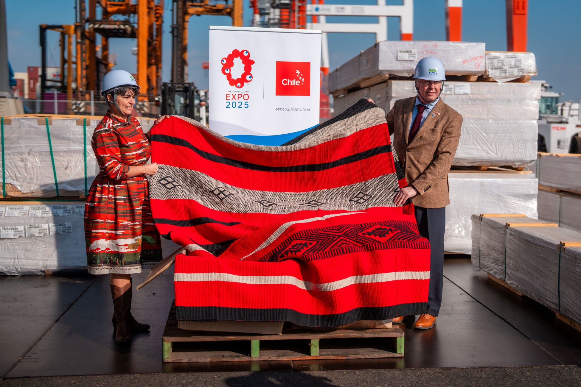 チリ貿易振興局(ProChile)は、2025年2月14日(金)、2025年大阪・関西万博のチリ館で展示される表面積242平方メートルを誇る巨大な手織物「マクン 『Makün』: 人々を包むチリの織物 (Makün: The Mantle of Chile、以下マクン)」が、大阪・南港に到着したことを発表しました。この見事な手織物のインスタレーションは、200人のチリ人の織り手によって丹念に制作され、大阪・関西万博でチリパビリオンの目玉の一つとなります。