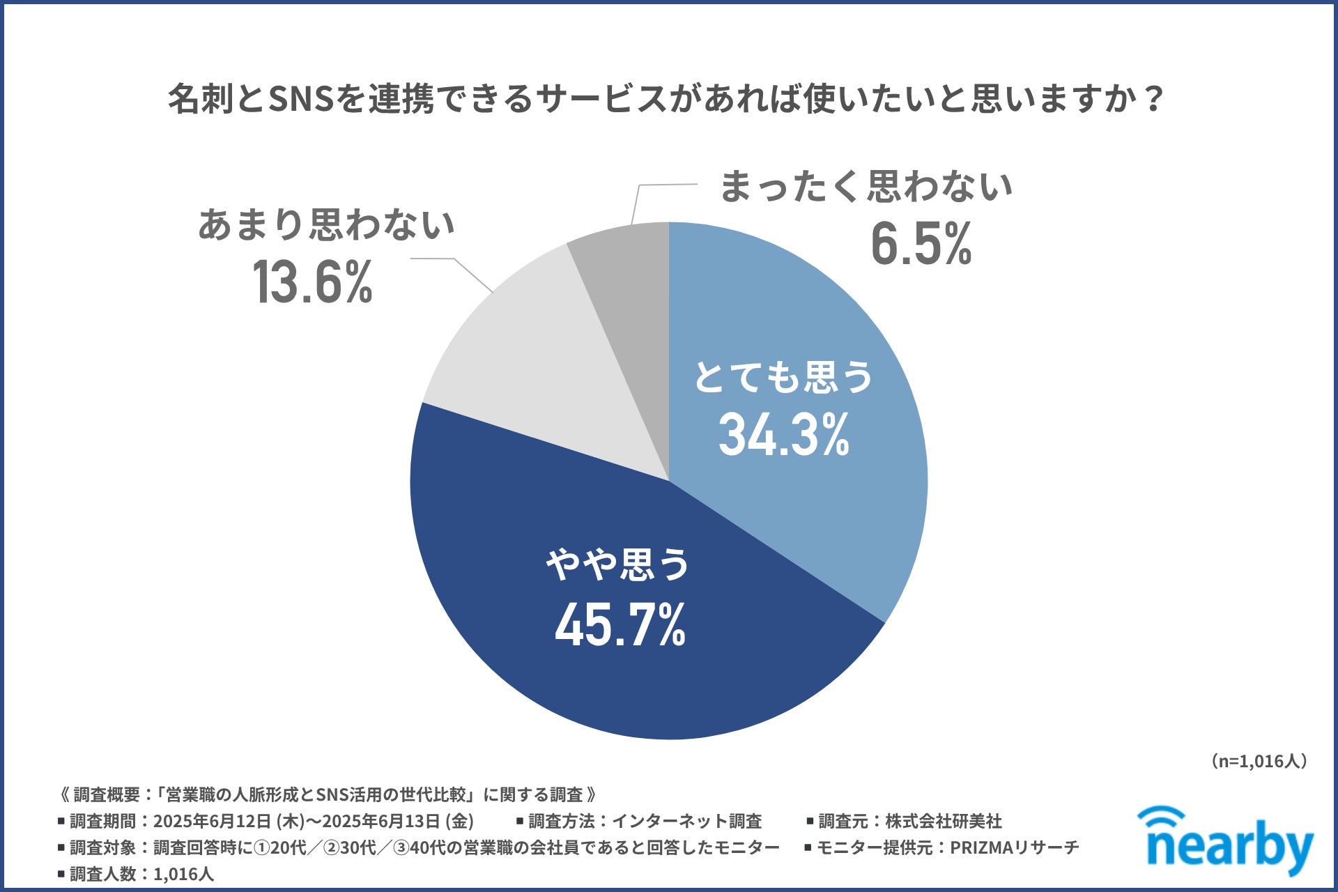 「名刺とSNSを連携できるサービスがあれば使いたいと思いますか?」について尋ねたところ、『とても思う(34.3%)』『やや思う(45.7%)』と、8割近くの営業職が利用意欲を示しました。