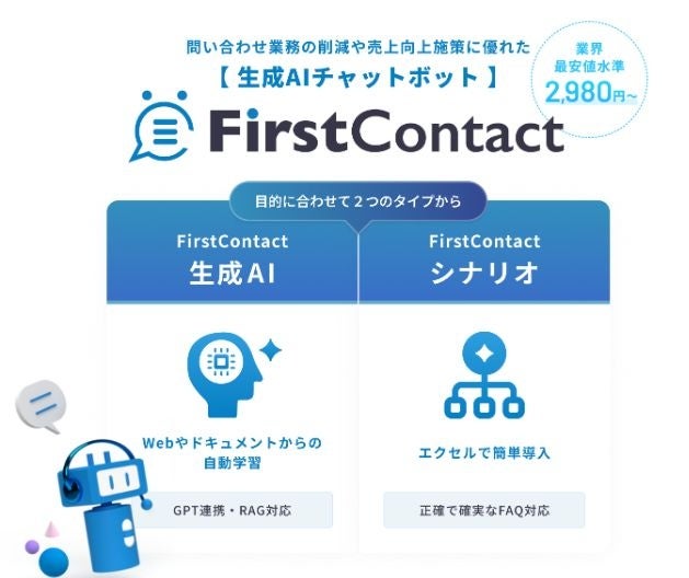 『FirstContact』はコストパフォーマンスに優れた生成AIチャットボット。シナリオ型と生成AIをハイブリット利用でき、成果と費用のバランスに優れた製品です。