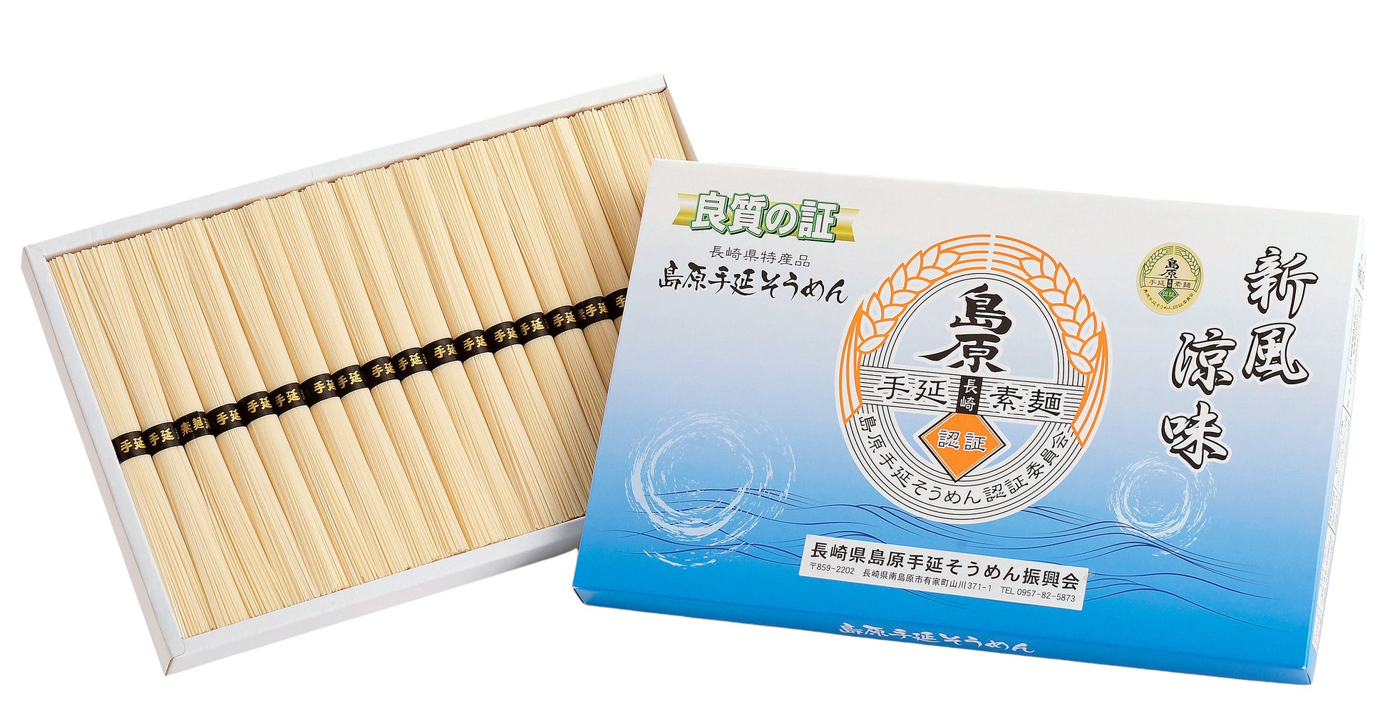 南島原市で作られる島原手延そうめんは、全国の手延そうめんの約30%を占める圧倒的な存在感。コシの強さ、なめらかなのどごし、その品質は「島原手延そうめん認証委員会」がしっかりチェックしています。原料、工場、食味まで厳しく審査をクリアしたものだけが名乗れるブランドです。