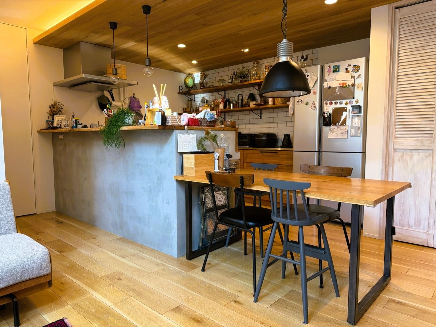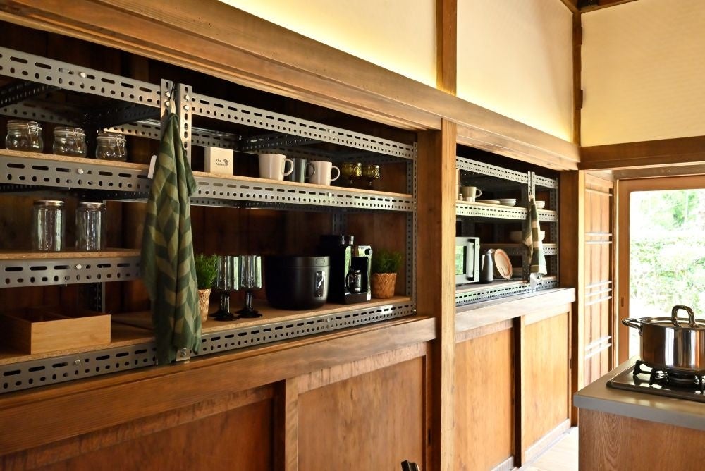 また、キッチン背面の押入れは既存建具を活かしながら、スチールラックや有孔ボード(無塗装・塗装)の組み合わせにより、背景の切り替えが可能な仕様としています。