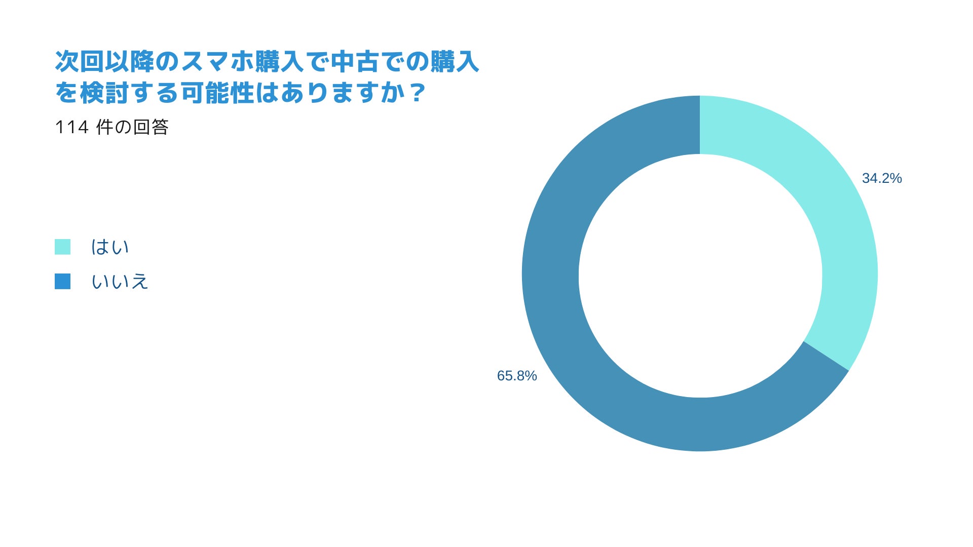 次回以降のスマホ購入で中古での購入を検討する可能性が「ある」と答えた人が39人(34.2%)、「ない」が75人(65.8%)でした。