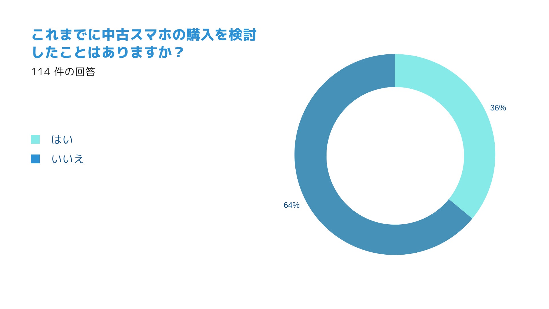中古スマホの購入を検討したことがある人は41人(36%)、検討したことがない人は73人(64%)でした。