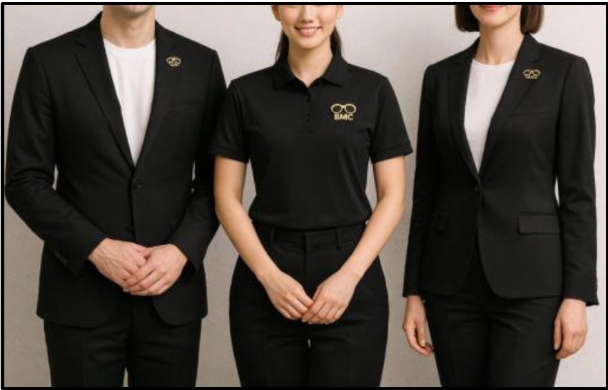 今回のリニューアルにあわせて、店舗スタッフのユニフォームも一新し、全店舗で導入して参ります。機能的でありながらお客様との信頼感やブランドイメージに合わせて、シックな黒のジャケットと黒のパンツをベースに、医療系の清潔感を示す白のインナーを合わせ、男女とも共有のジェンダーレス・ユニフォームとして着用いたします。また、自社オリジナルのピンバッジを製作し胸元につけることで、自社らしさを発信いたします。