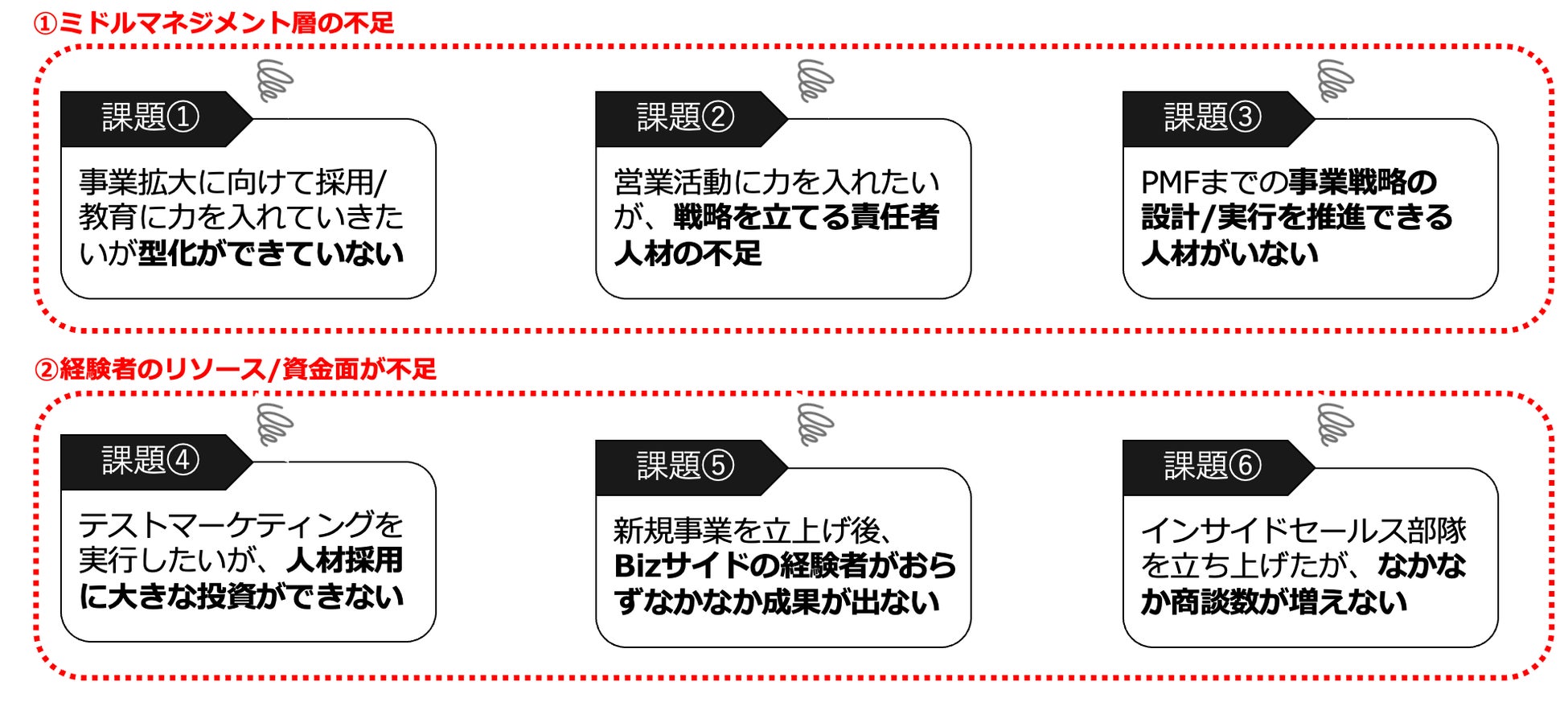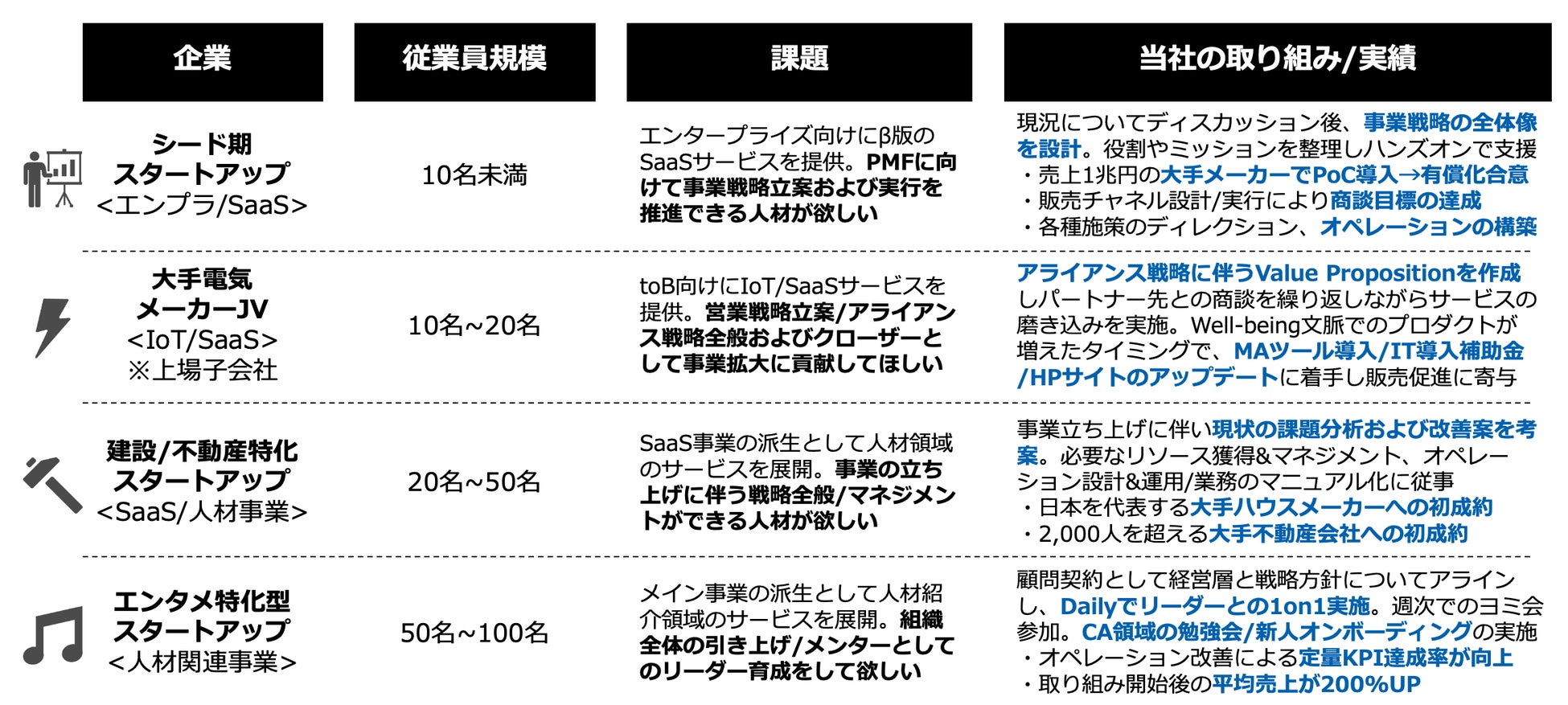 フェーズとしては、リソース/資金が十分でないシード期~アーリー期のビジネスサイド領域を中心に、事業拡大に耐え得る組織構築やPMFに伴うプロダクトの勝ちパターン攻略など事業課題に沿ったご支援をさせていただきます。
