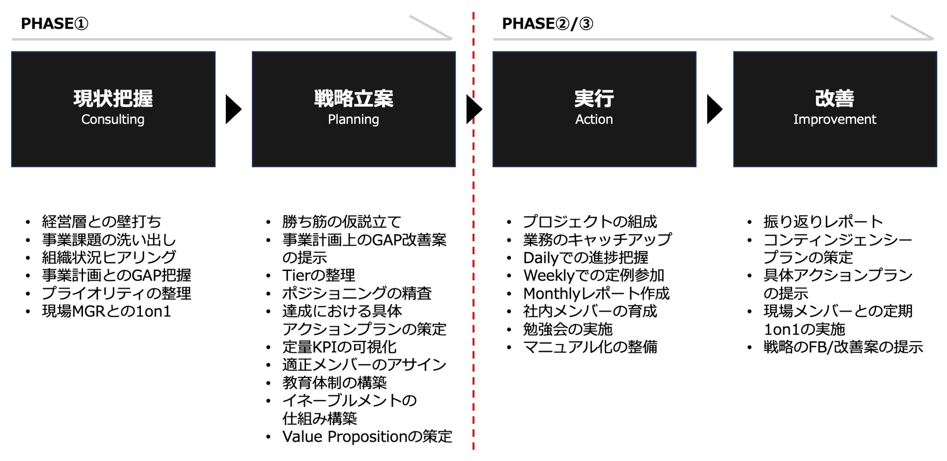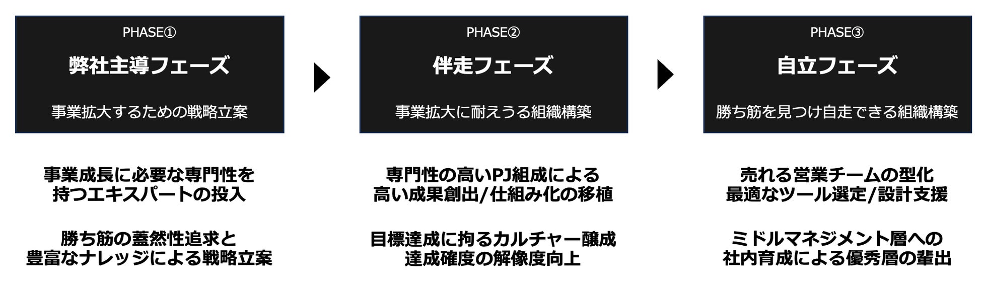 組織フェーズや課題によって適切なプロジェクトの組成を実施し、最短で事業拡大できる体制を目指していきます。