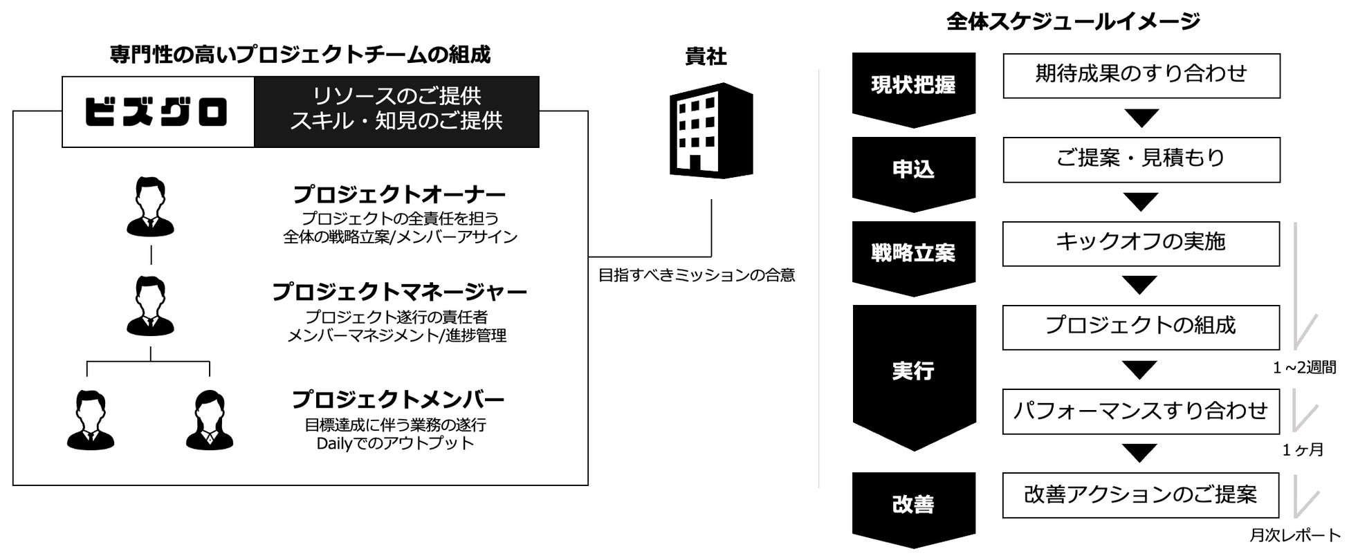 ビズグロは、「事業の勝ち筋を見つけ、強い営業組織の自走化により継続的に事業拡大させるサービス」として、専門性の高いプロジェクトチームがスタートアップの課題に合わせた伴走型のご支援をさせていただきます。